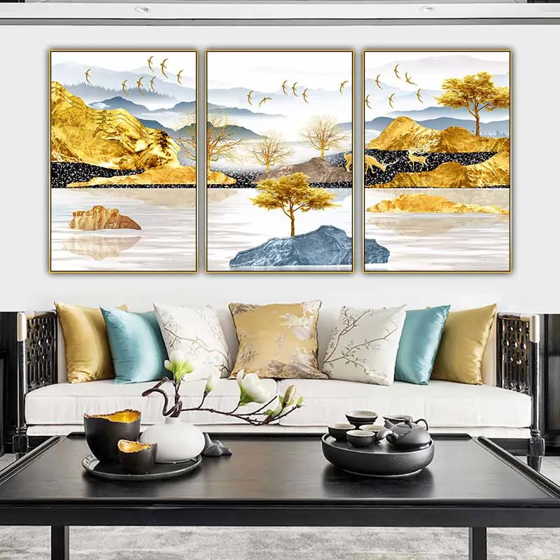 Bức tranh phong cảnh này mang đến một cảm giác thanh bình với mặt hồ phẳng lặng tràn đầy ánh vàng chói chang. Điểm nhấn của bức tranh là đồi núi, được tô điểm bởi màu vàng trừu tượng, tạo nên một sự đối lập đẹp mắt của mặt hồ. Màu vàng gold được sử dụng một cách tinh tế, tạo nên một sự tương phản hoàn hảo với không gian tự nhiên xung quanh.