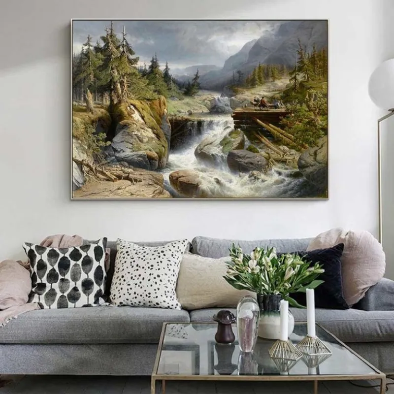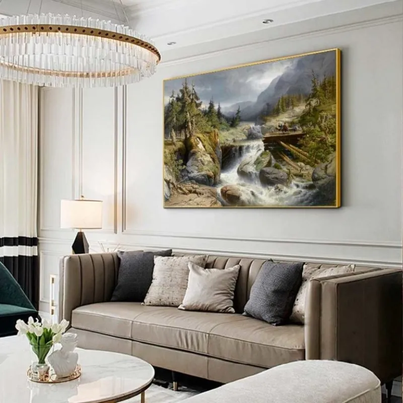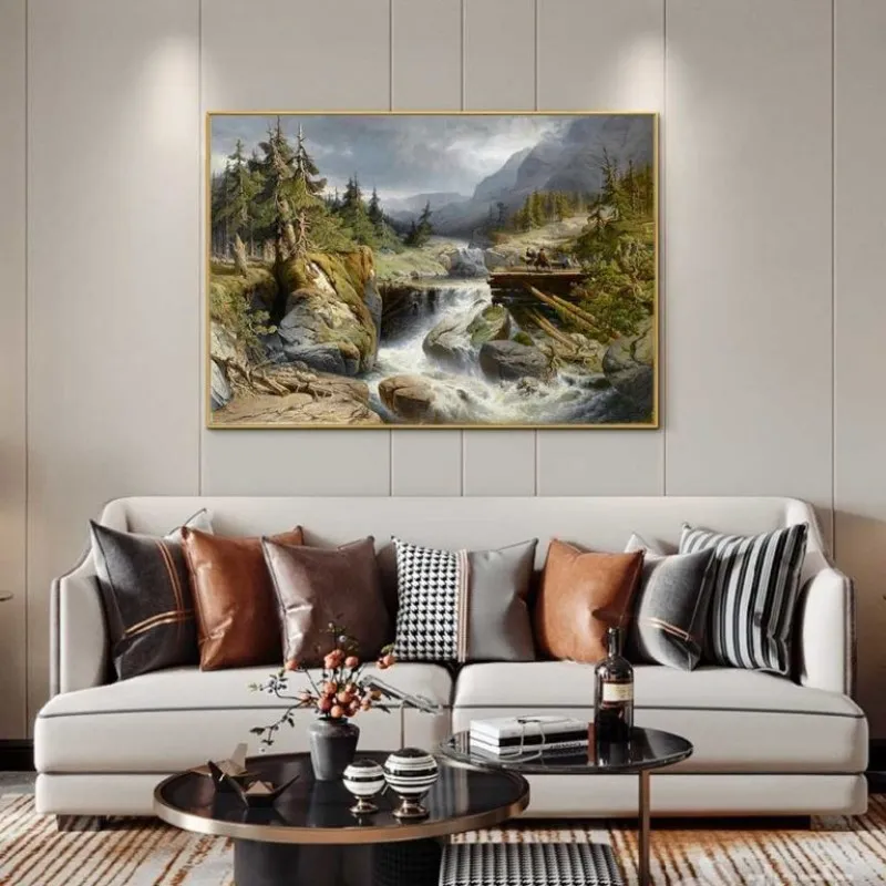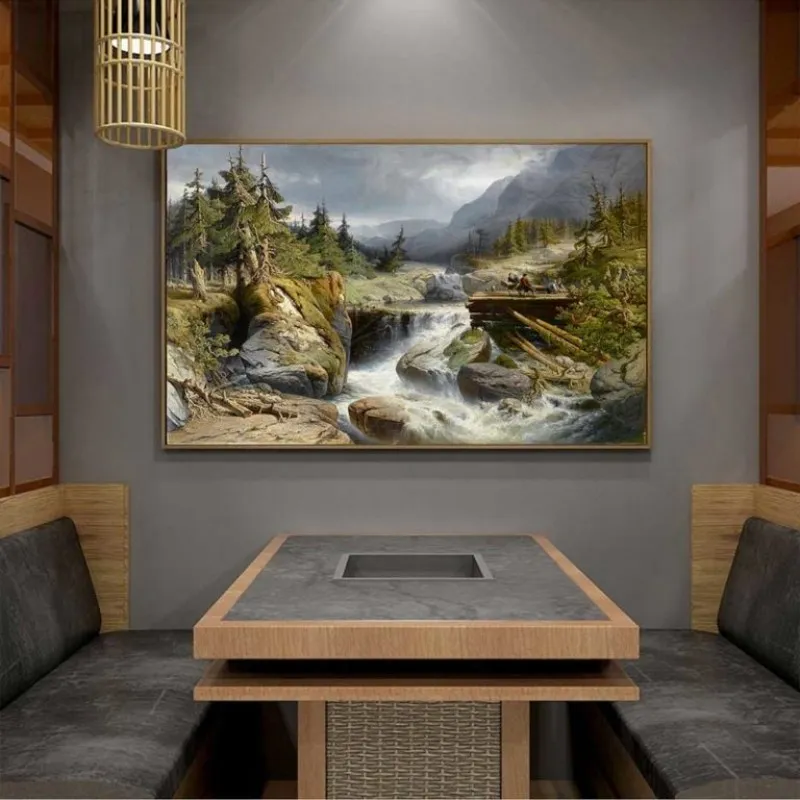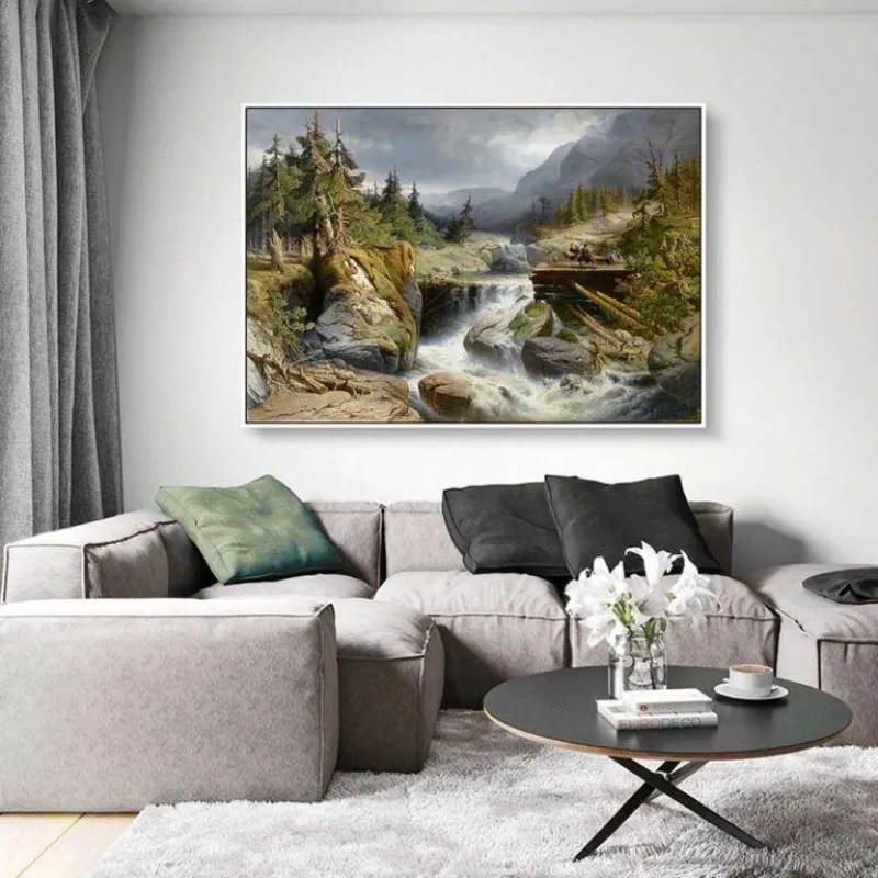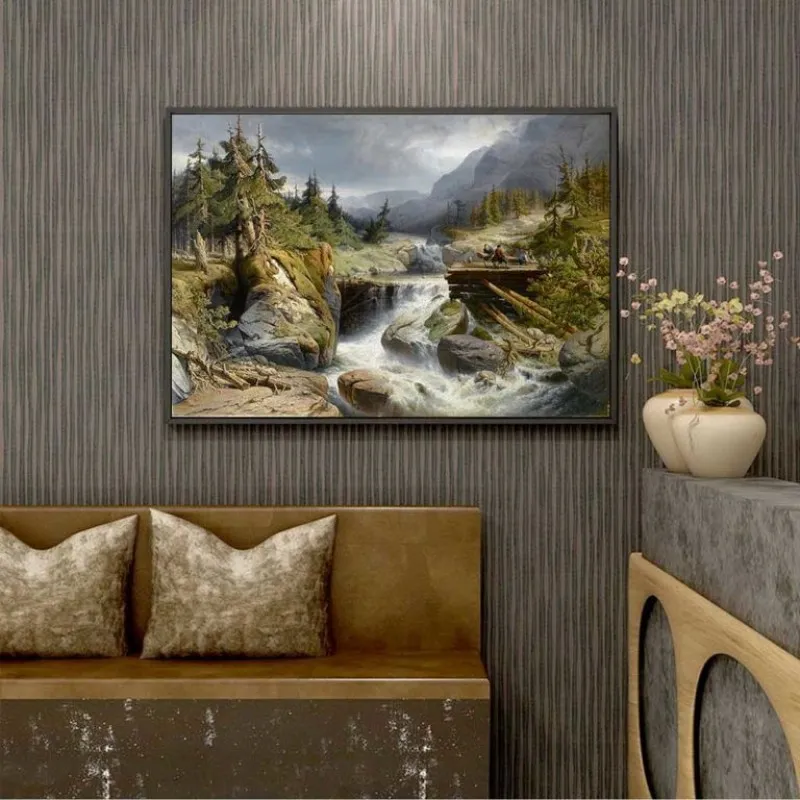 Tranh phong cảnh miền núi với những người khai thác gỗ gần thác nước của Họa sĩ Gerard Joseph Adrian Van Luppen. Gerald học tại Học viện Anvers. Ông đã nhận được nhiều huy chương trong suốt sự nghiệp của mình bao gồm ở Brussels năm 1872, ở Vienna năm 1873 và ở Philadelphia vào năm 1876.