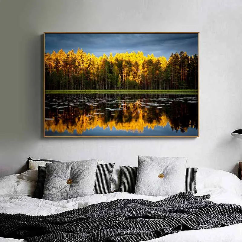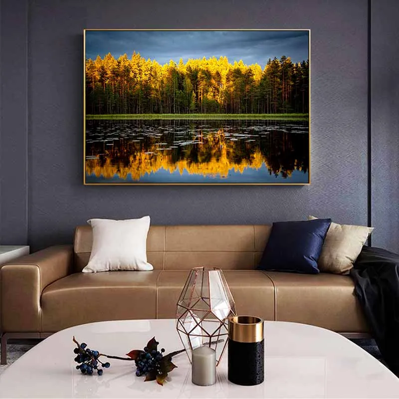 Tranh phong cảnh mùa thu với hàng cây bên dòng sông