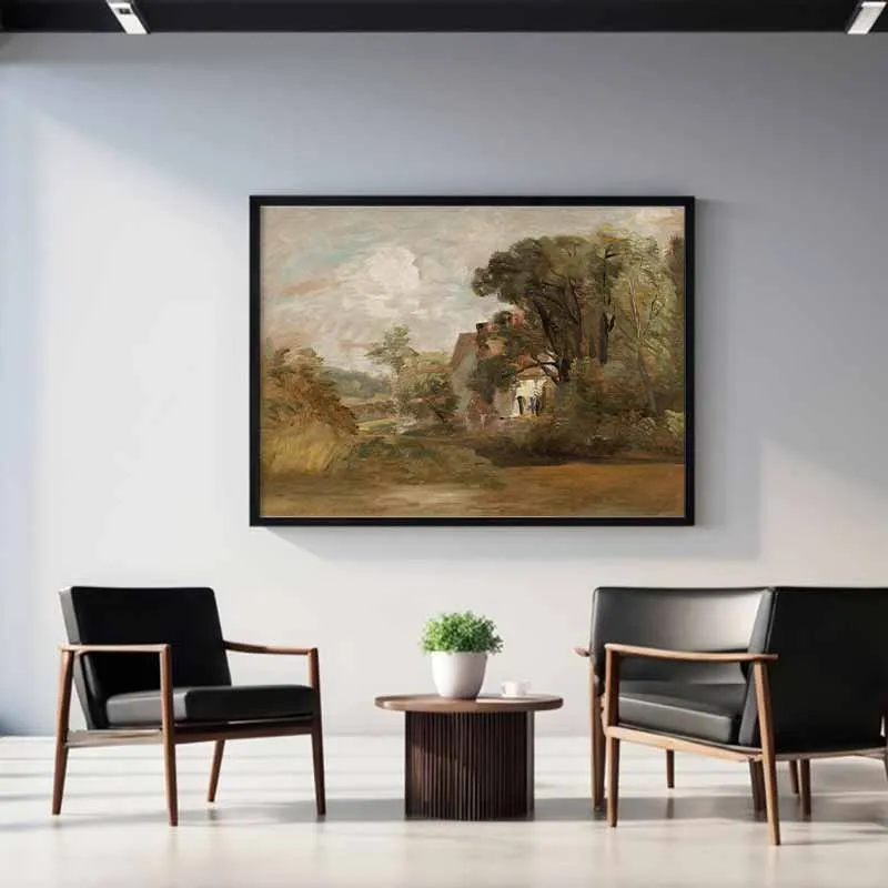 Bức tranh phong cảnh này khắc họa một ngôi nhà nông thôn ấm cúng ẩn mình giữa khung cảnh thiên nhiên xanh tươi và rộng lớn. Với nét vẽ cổ điển, màu sắc trầm ấm, tự nhiên và bố cục gần gũi, tác phẩm mang lại cảm giác bình yên, hoài niệm và sự thư thái, như một lời mời gọi đến cuộc sống an lành, tách biệt khỏi sự ồn ào của đô thị.