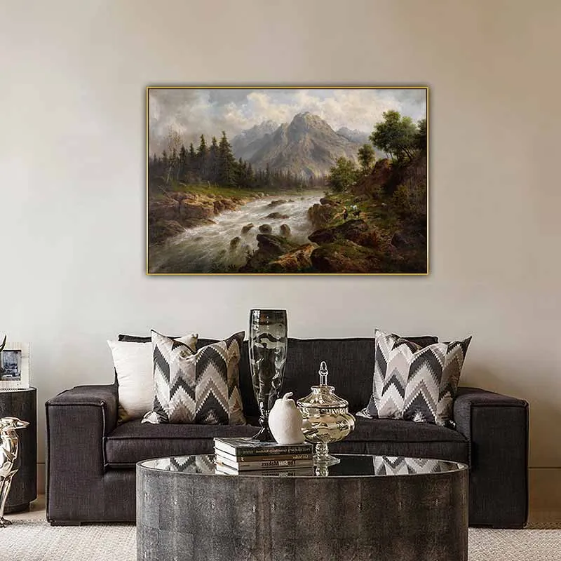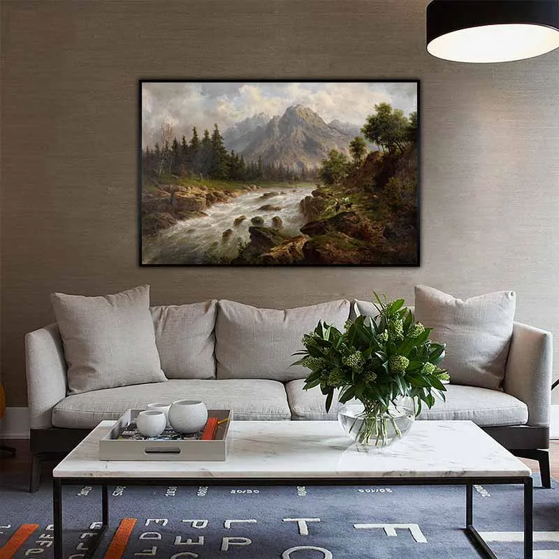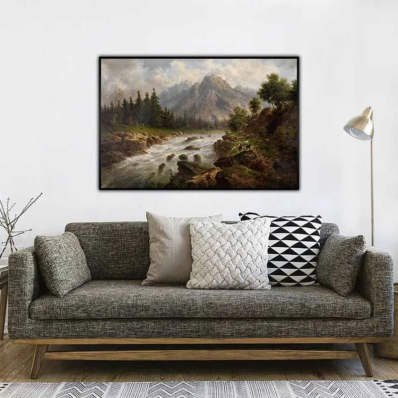 Tranh phong cảnh người chăn dê đang đứng nhìn qua bên kia dòng suối với ngọn núi to hùng vĩ