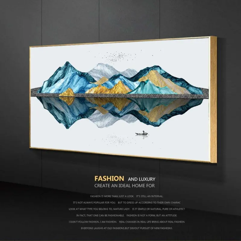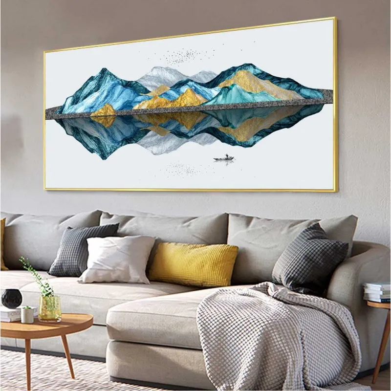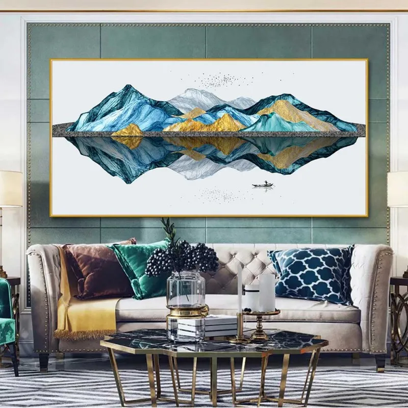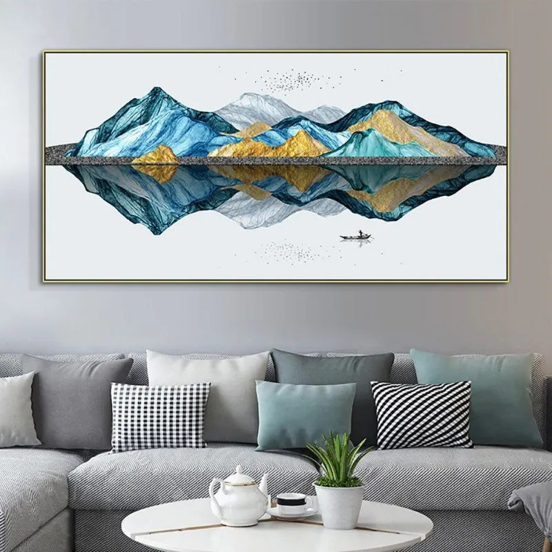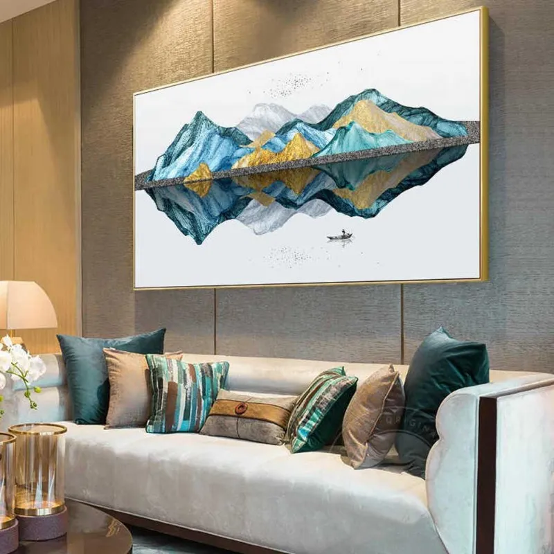 Tranh in canvas phong cảnh người chèo thuyền trên sông, đồi núi trừu tượng.