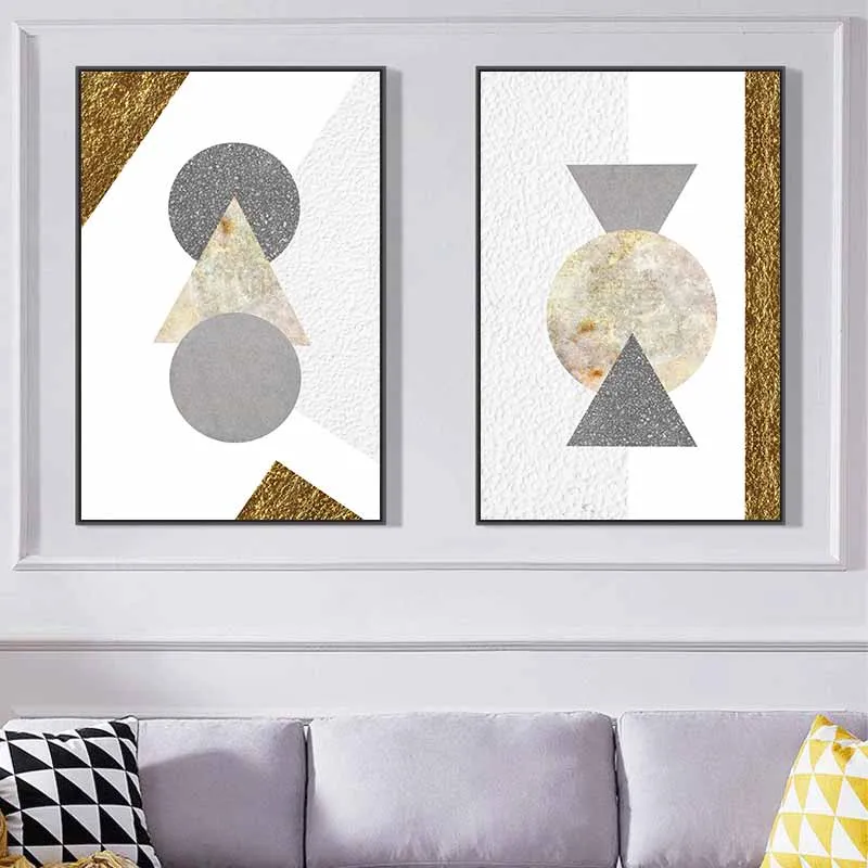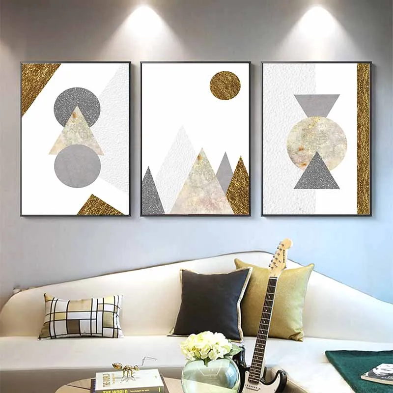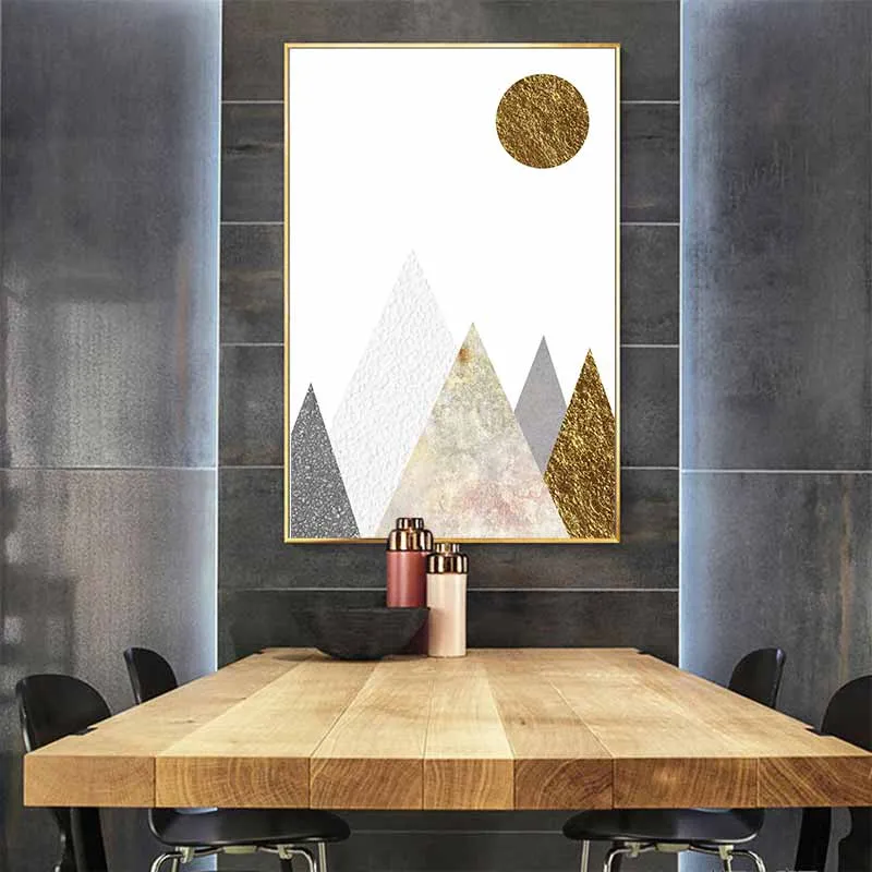 Tranh phong cảnh núi đồi mặt trời trừu tượng các hình tam giác và hình tròn