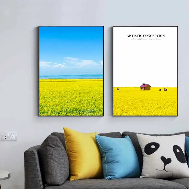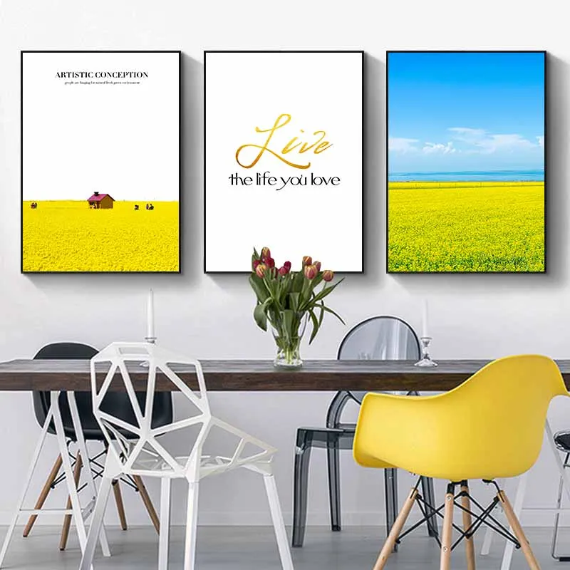 Tranh phong cảnh scandinavia cánh đồng vàng và cành hoa kết hợp chữ Live the life you love