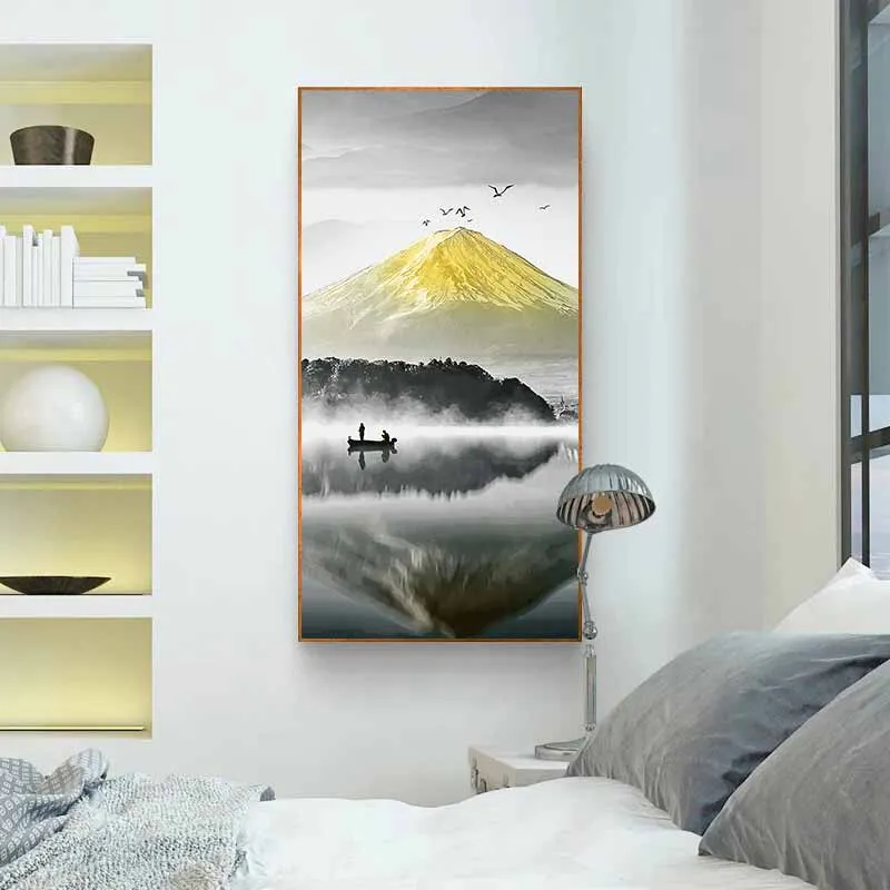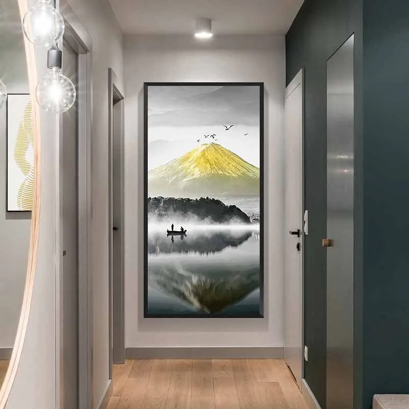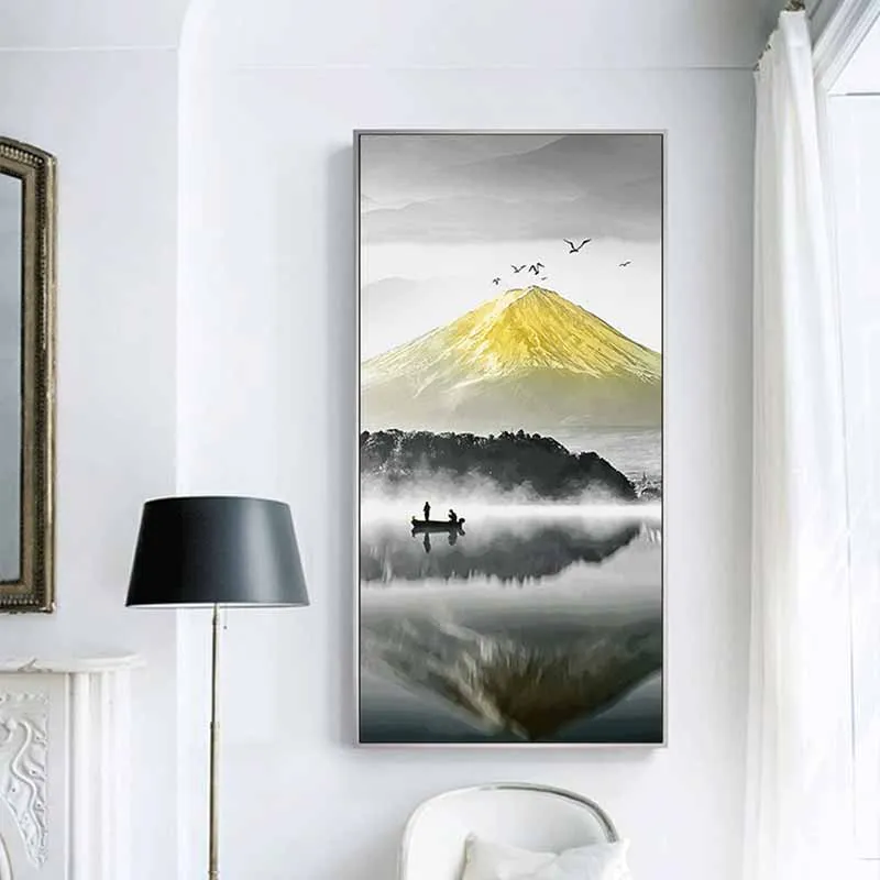 Tranh phong cảnh Scandinavia đồi núi và con thuyền trên dòng sông tĩnh lặng
