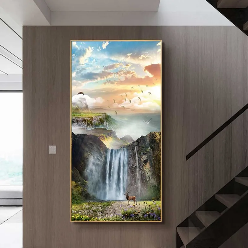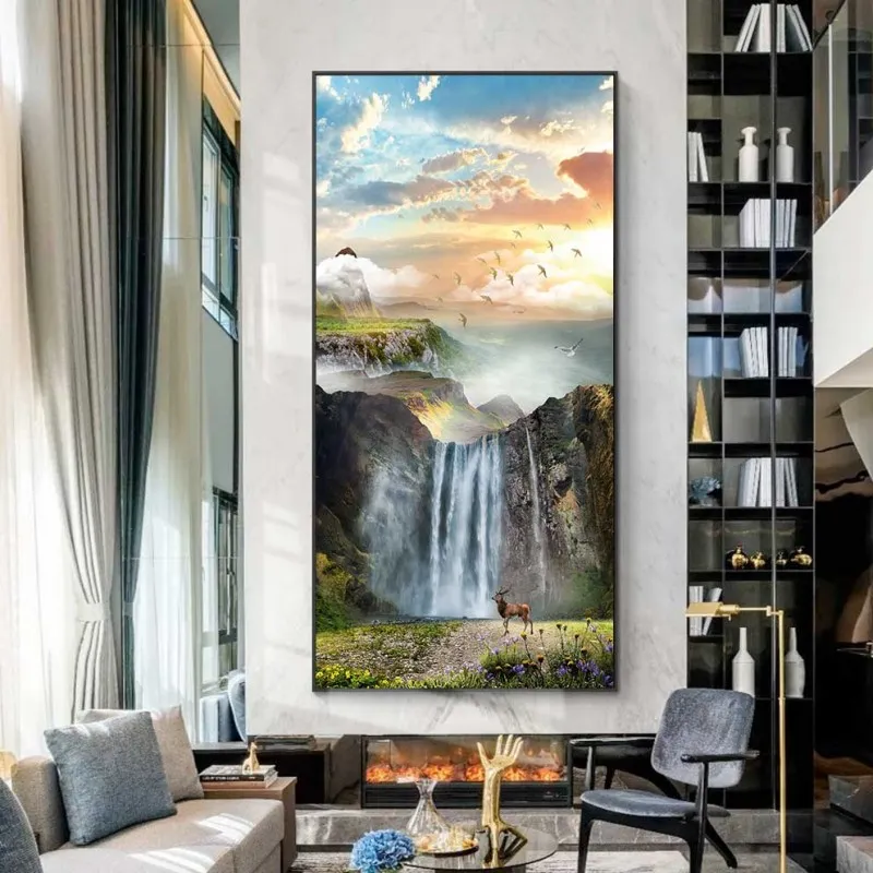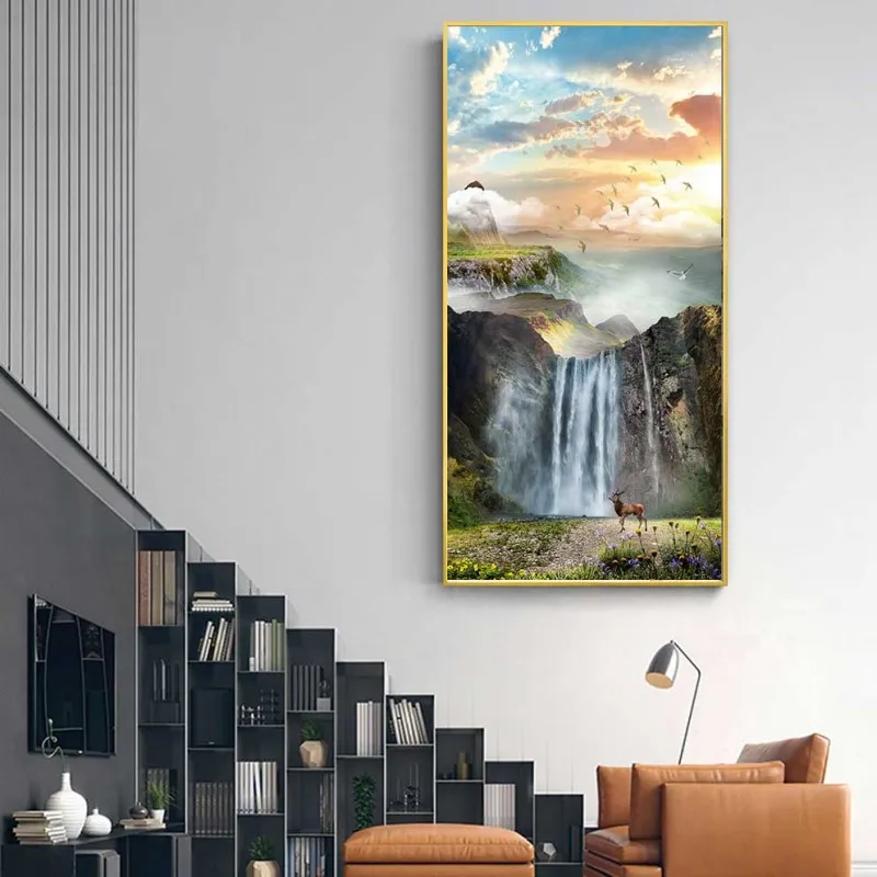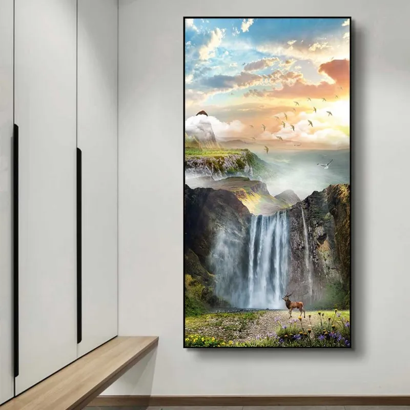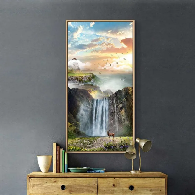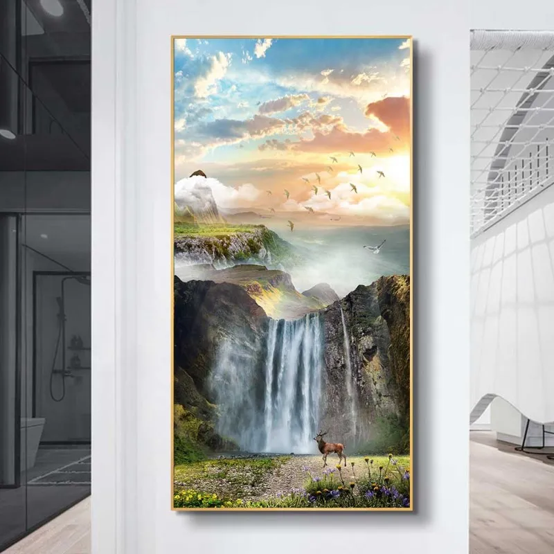 Tranh in canvas phong cảnh núi rừng, thác và nai. Tranh thích hợp treo ở phòng khách, phòng làm việc, chân cầu thang…