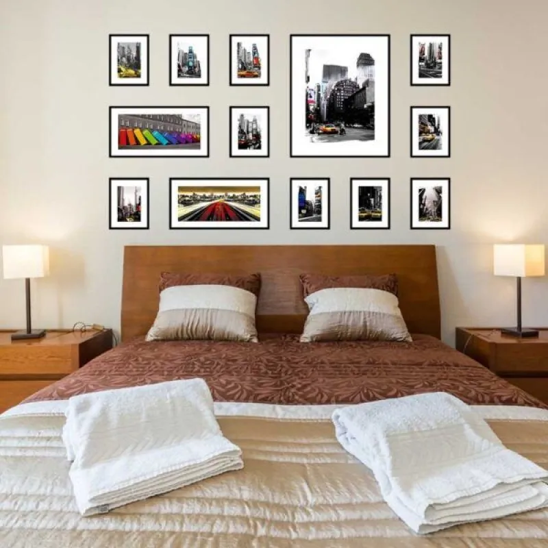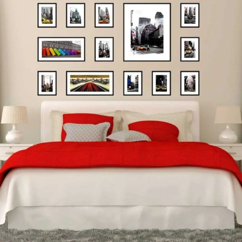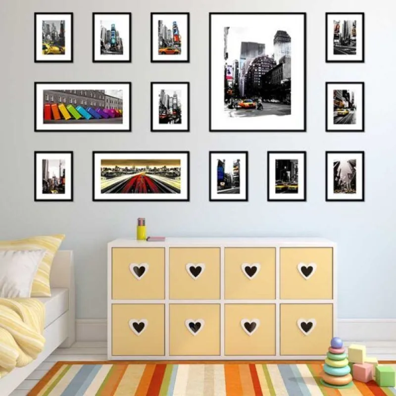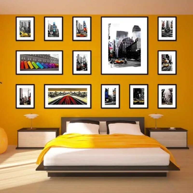 Tranh in canvas phong cảnh tòa nhà, tấm biển quảng cáo, taxi màu vàng, xe ô tô bán tải, trên nền trắng đen. Tranh thích hợp treo ở phòng khách, phòng làm việc, phòng ngủ, nhà hàng, quán ăn…