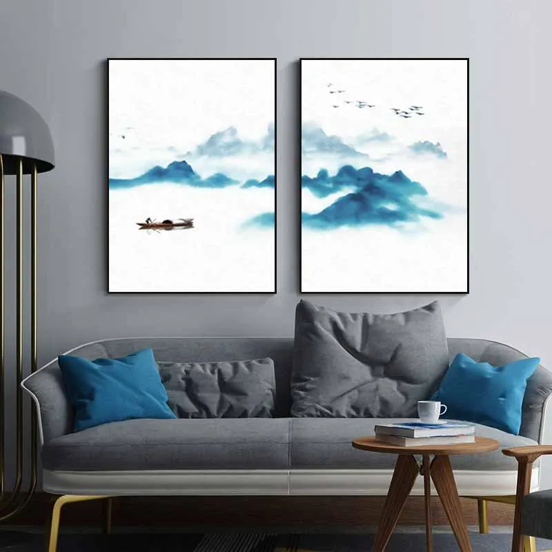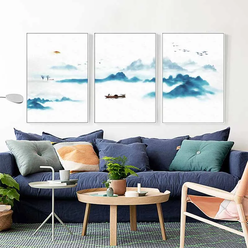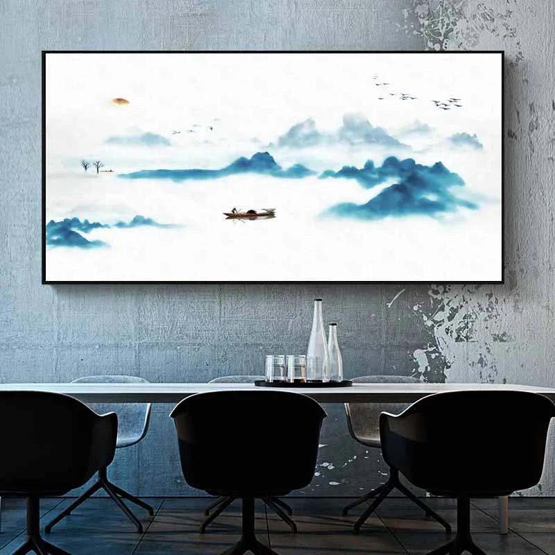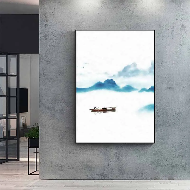 Tranh phong cảnh thủy mặc con thuyền trên dòng sông
