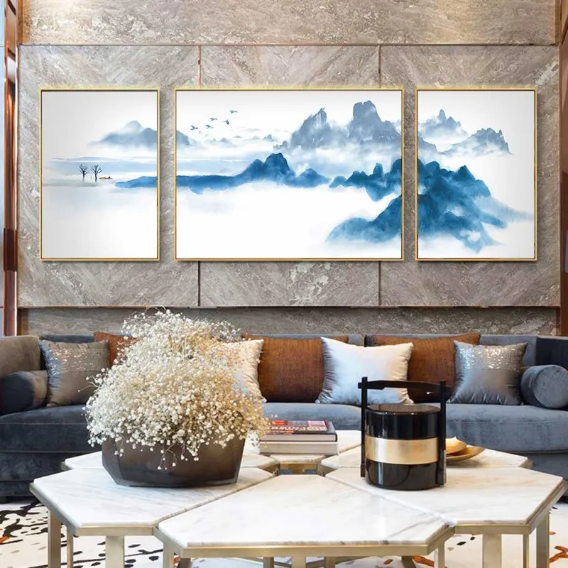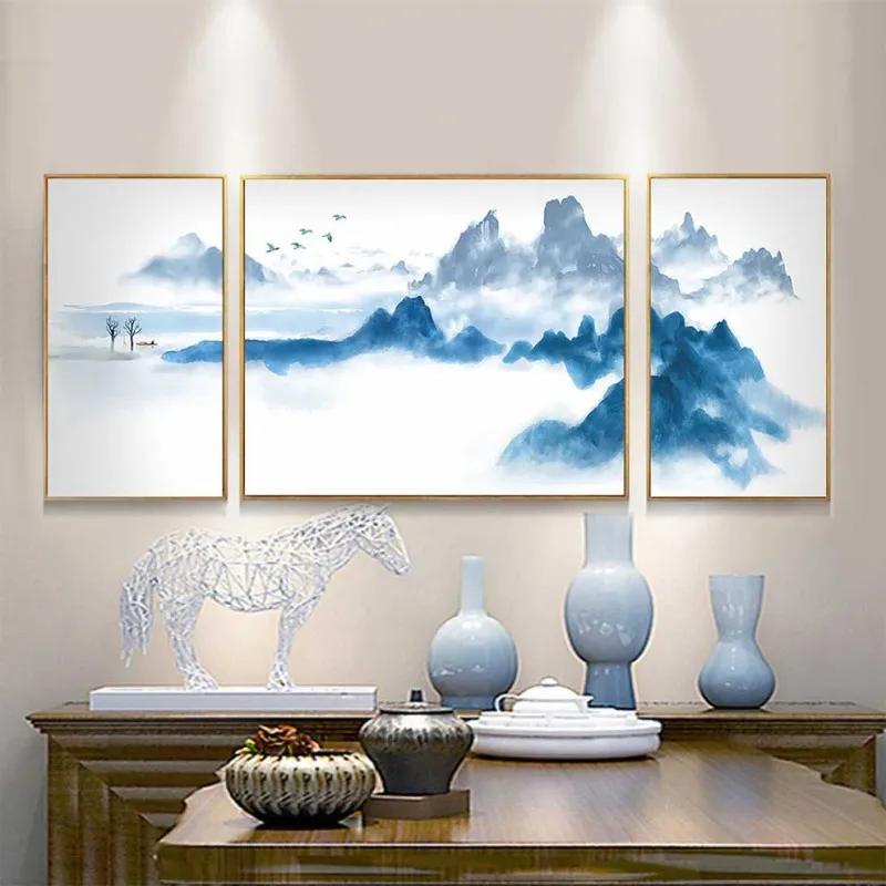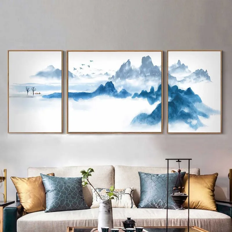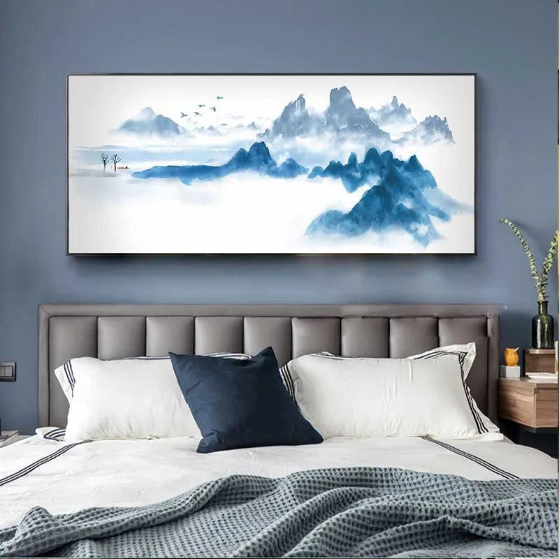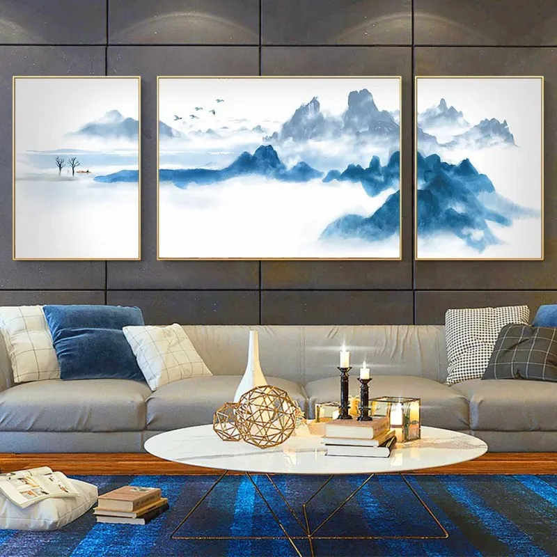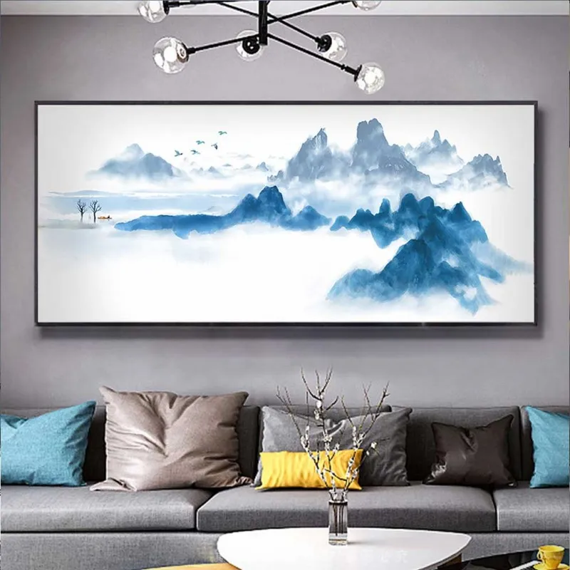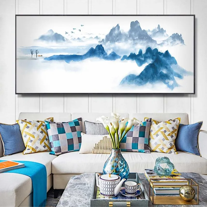 Tranh in canvas phong cảnh trừu tượng dải đồi núi dài và dòng sông với người chèo thuyền, ở đằng xa là đan chim đang bay lượn. Tranh với tông màu xanh chủ đạo làm cho không gian phòng trở nên mát mẻ.