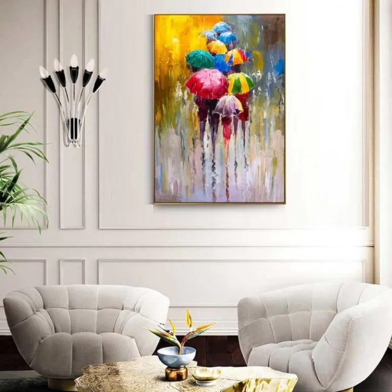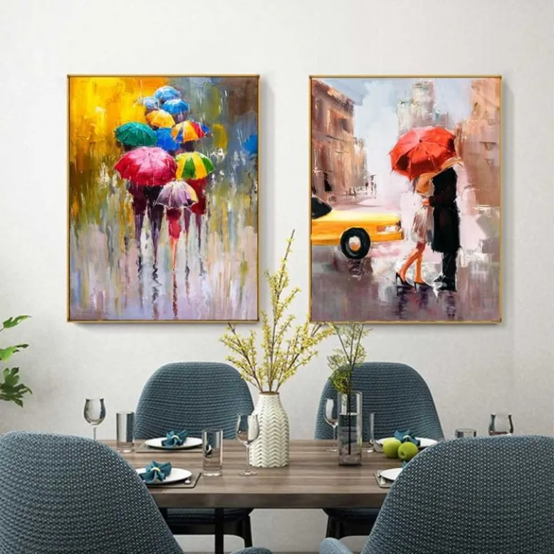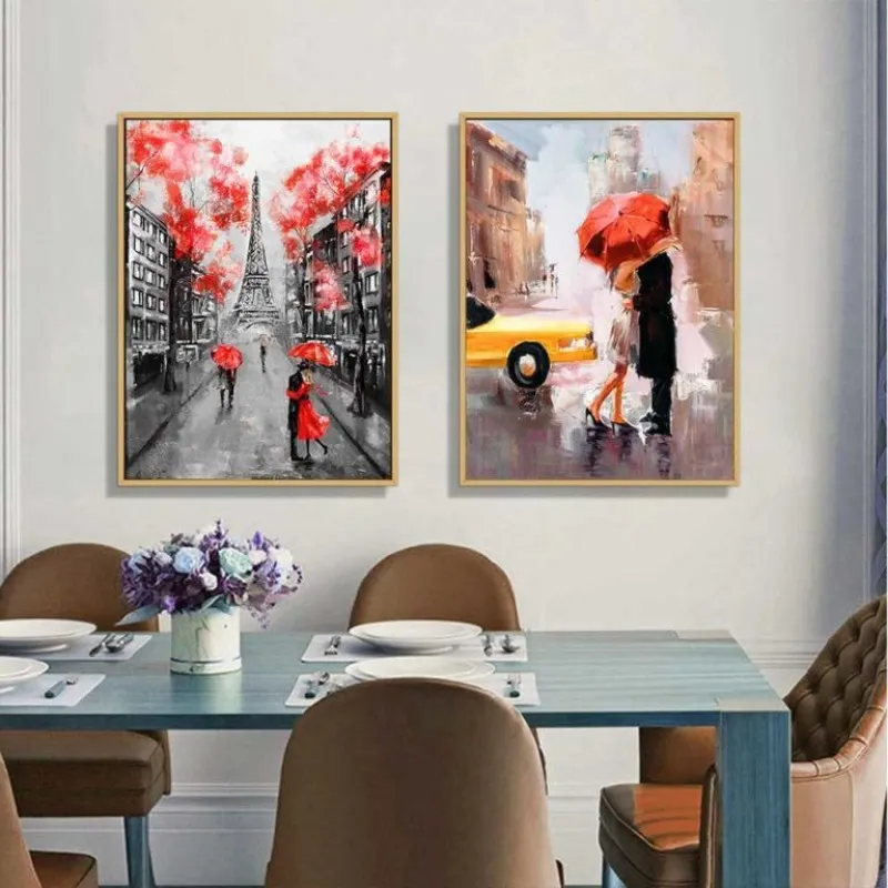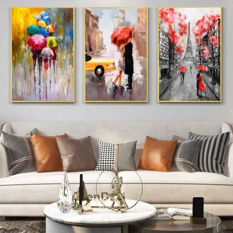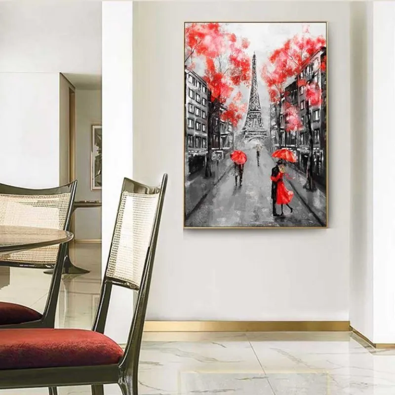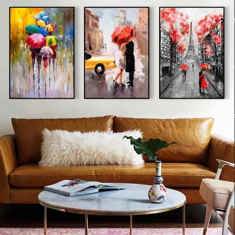 Tranh in canvas những người che dù đi dưới mưa theo nhóm, những đôi tình nhân che dù dưới những cây hoa đỏ rực, phía xa là tháp Eiffel, đôi tình nhân hôn nhau dưới mưa thẹn thùng dùng chiếc dù che lại, bên cạnh chiếc taxi màu vàng, Tranh được in lại từ thể loại tranh sơn dầu trừu tượng.