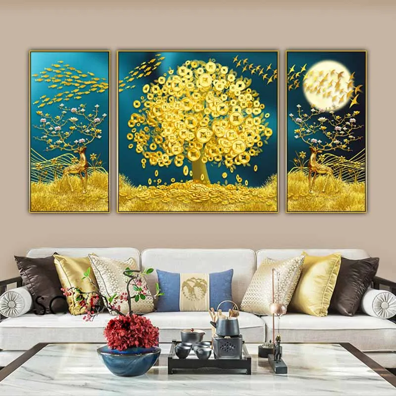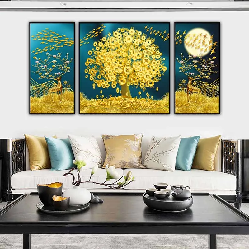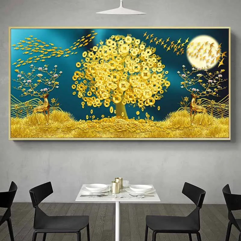 Tranh phong thủy 2 con hươu nai vàng sừng đầy hoa đứng cạnh cây có những đồng tiền vàng