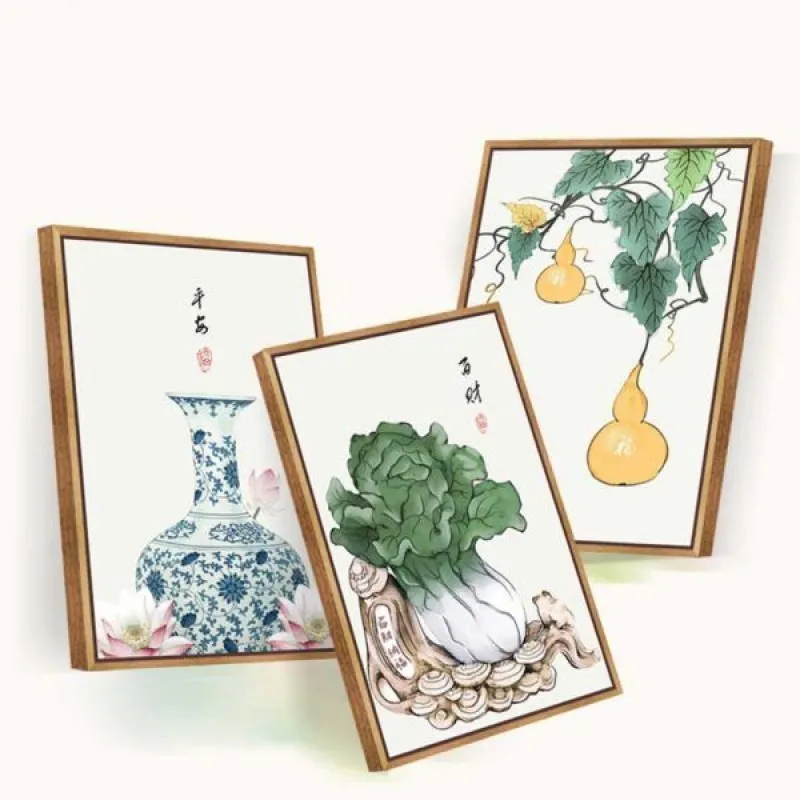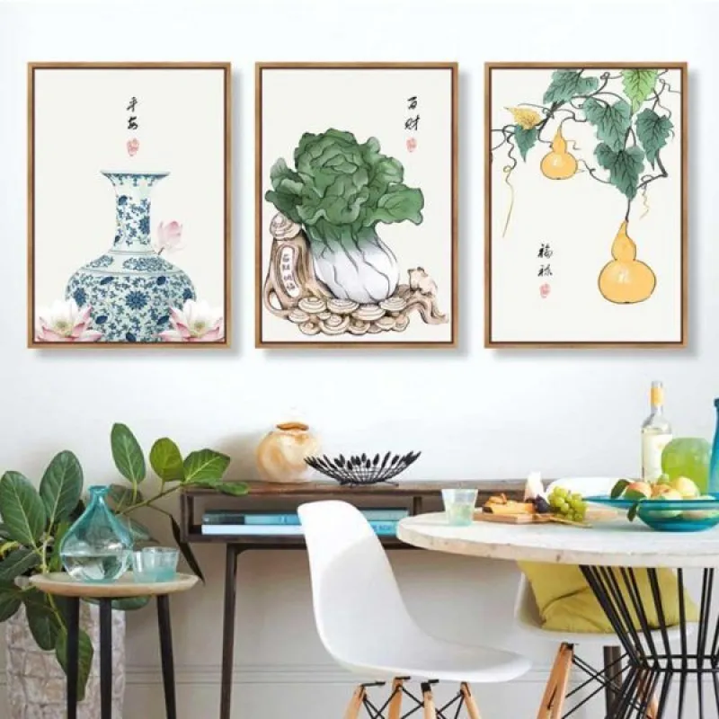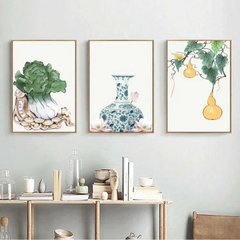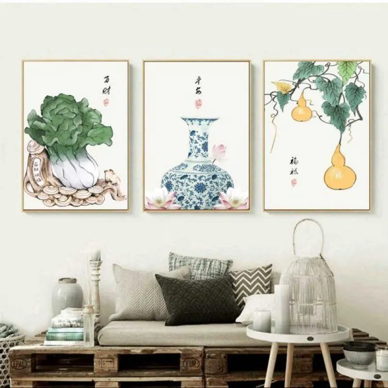 Tranh in canvas phong thủy bình hoa, bắp cải và hồ lô đều là những vật tượng trưng cho của cải và tài lộc. Bình gốm thường được gọi là lục bình hay lộc bình, chữ lộc trong lộc bình có nghĩa là tài lộc. Còn bắp cải thì tượng trưng cho của cải, sự giàu sang nên thường được dùng để tặng các doanh nghiệp khai trương văn phòng hay cơ sở làm ăn. Hồ lô, theo truyền thuyết thì dùng để chứa linh đơn, thuốc tiên nên được coi là biểu tượng cho sức khỏe. Như vậy với bộ tranh này có thể xem như là đem lại sự may mắn, của cải và sức khỏe cho gia đình. Tranh thích hợp treo ở phòng khách, phòng làm việc, phòng ngủ, hoặc làm quà tặng tân gia hay khai trương…