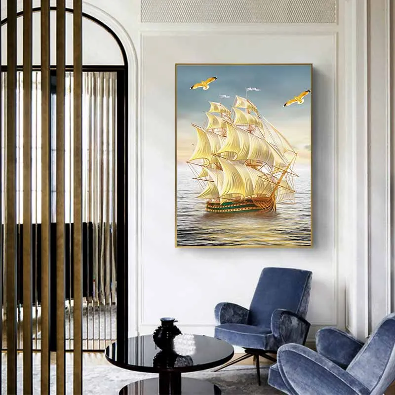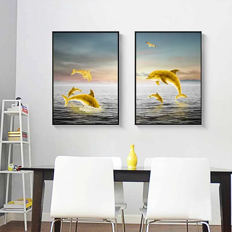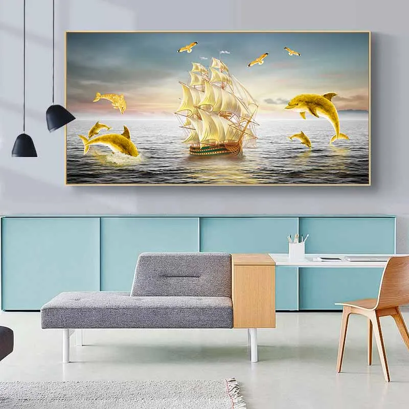Tranh phong thủy đàn cá heo và thuyền buồm vàng