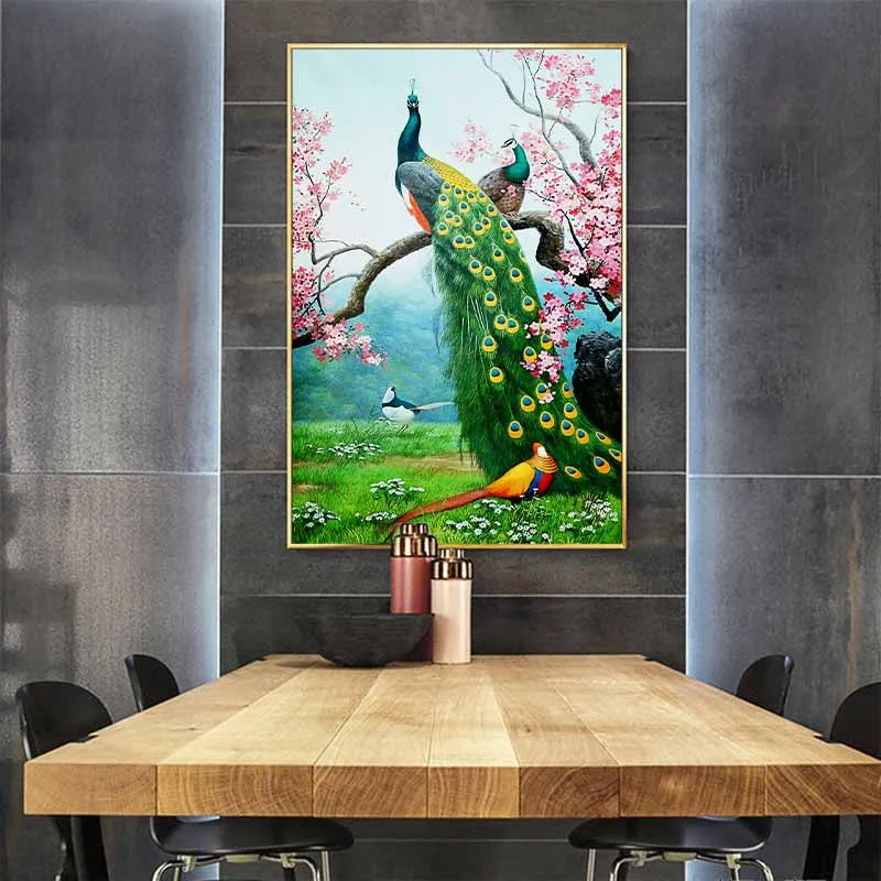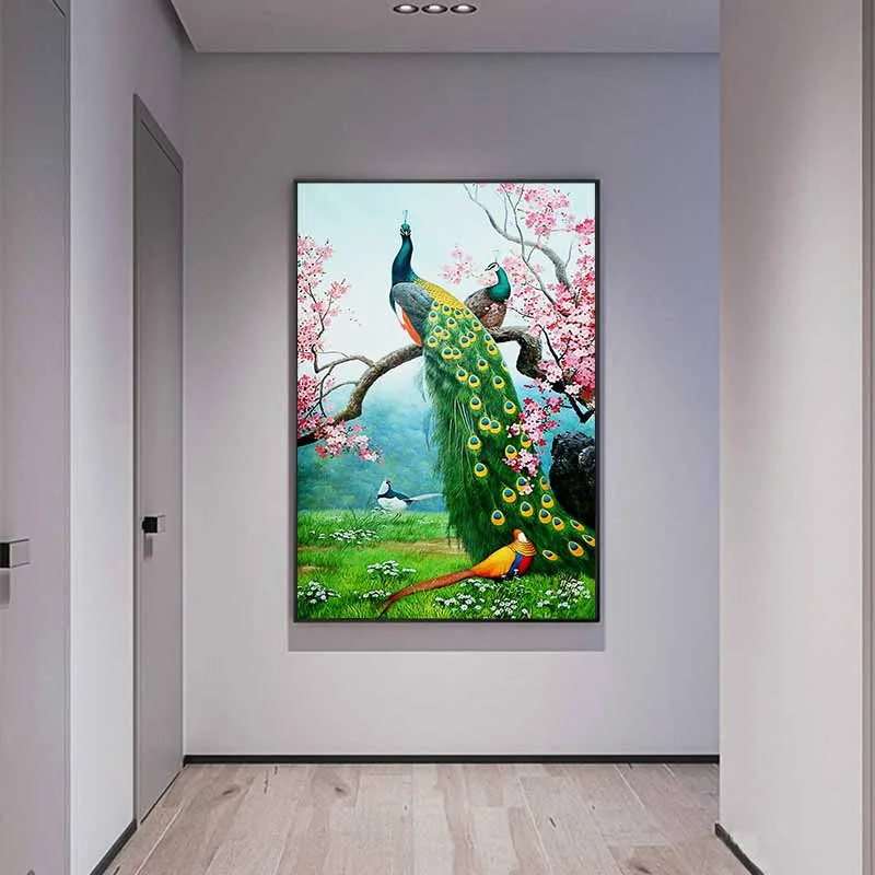 Tranh phong thủy đôi chim công đứng trên cành hoa đào, phía dưới là 2 loài chim trĩ golden pheasant (chim trĩ vàng) và silver pheasant (chim trĩ bạc). Bức tranh mang ý nghĩa về sự thành công đang ở đỉnh cao, phía dưới là vàng và bạc tượng trưng cho giàu sang phú quý. (đôi chim công đứng trên cao, ở dưới là trĩ vàng và trĩ bạc)