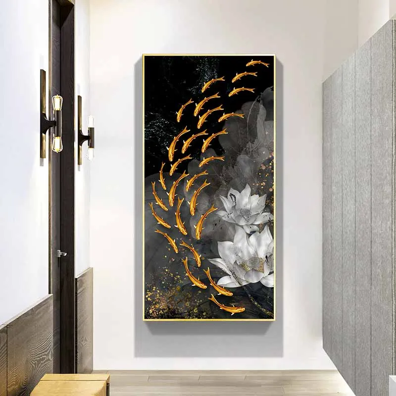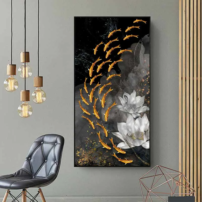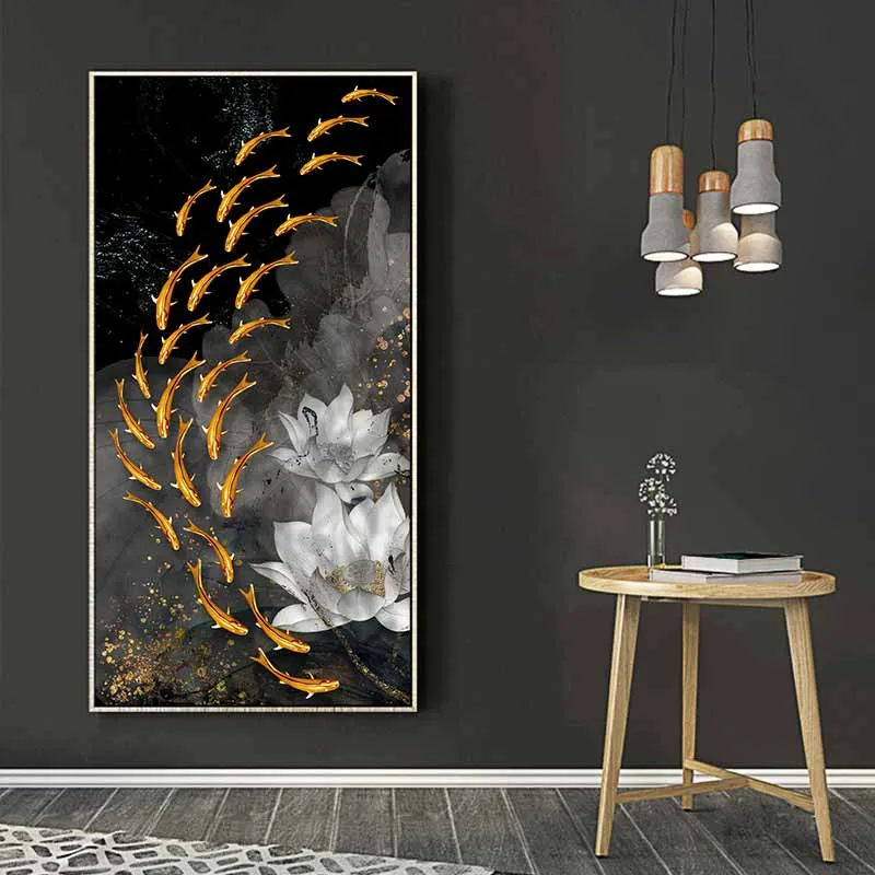 Tranh phong thủy Quần ngư hội tụ trừu tượng và hoa sen