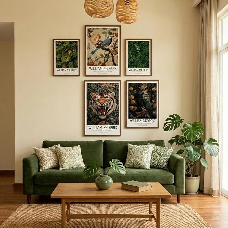 Lý do: Những tông màu trầm tĩnh (xanh đậm, nâu) và họa tiết lặp lại mang tính quy luật của tranh William Morris có tác dụng làm dịu tâm trí, giúp tăng cường sự tập trung và mang lại cảm giác bình yên, sâu lắng cho không gian cần sự yên tĩnh.