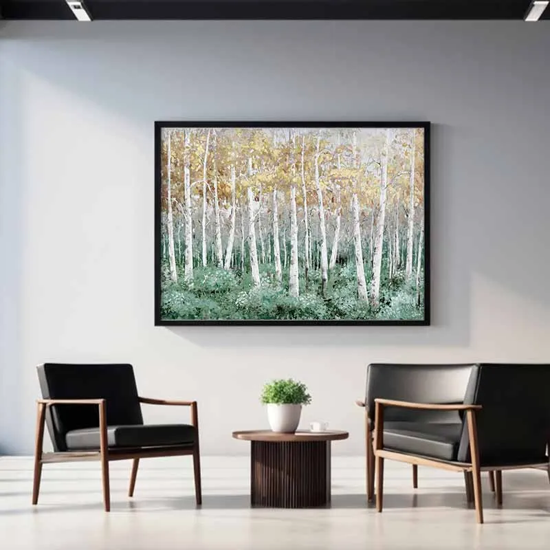 - Không gian có bảng màu trung tính: Bức tranh sẽ rất nổi bật và hài hòa khi được đặt trong không gian có các tông màu trung tính như trắng, be, xám, hoặc nội thất gỗ sáng màu, giúp làm nổi bật vẻ đẹp của cây bạch dương.