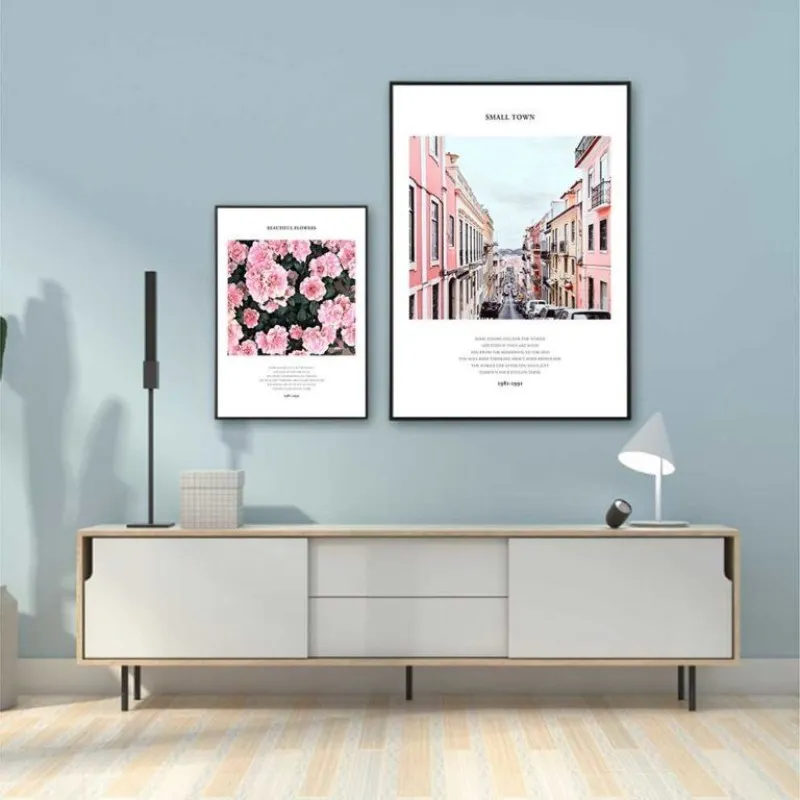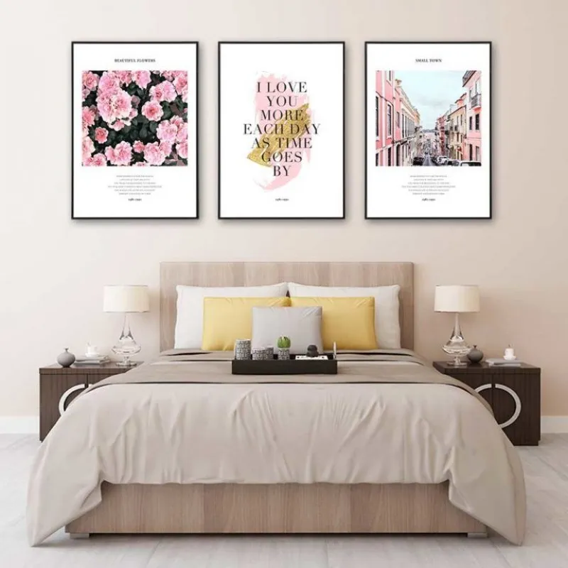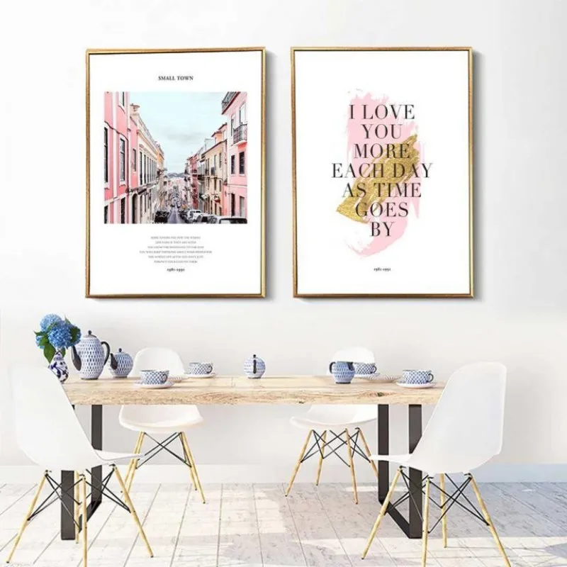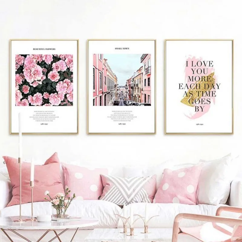 Tranh in canvas hoa hồng, thành phố kết hợp chữ I love you more each day as time goes by với tông màu hồng tươi.