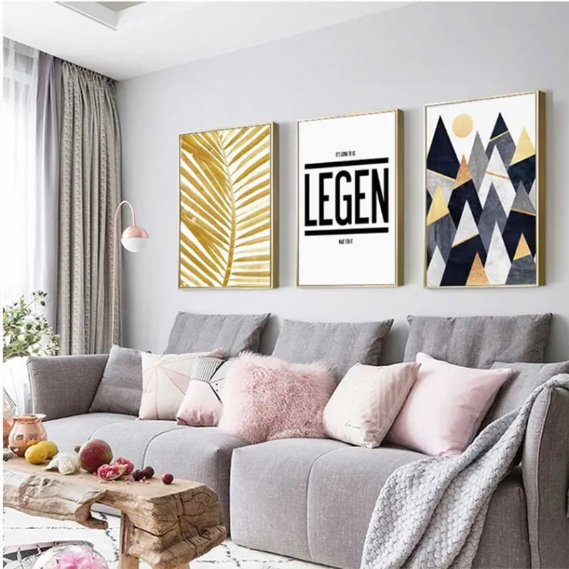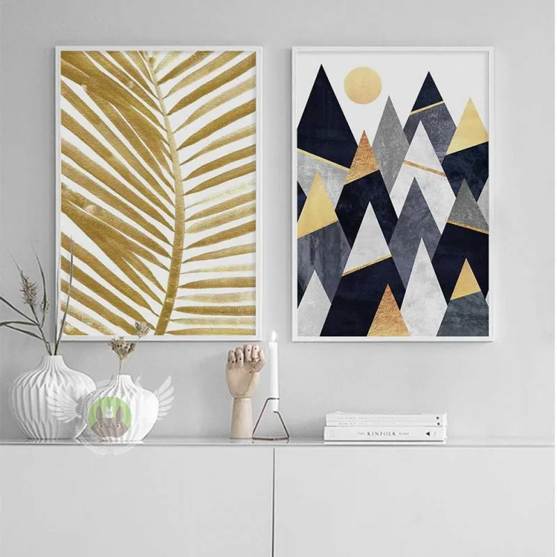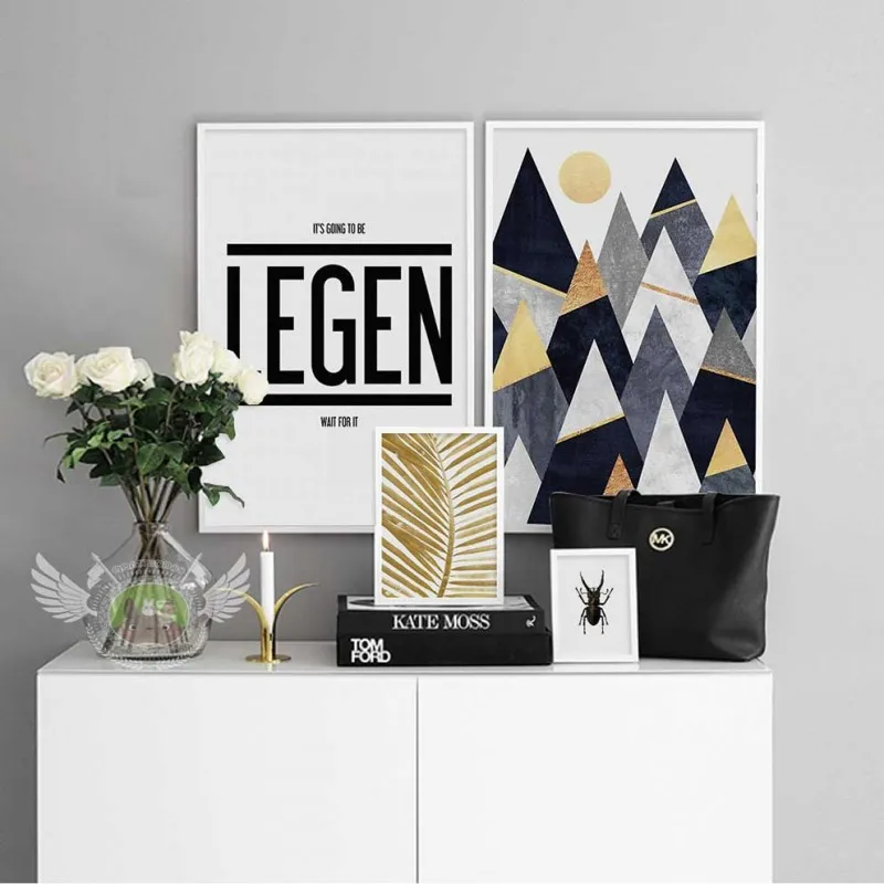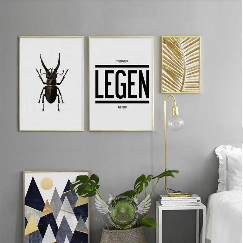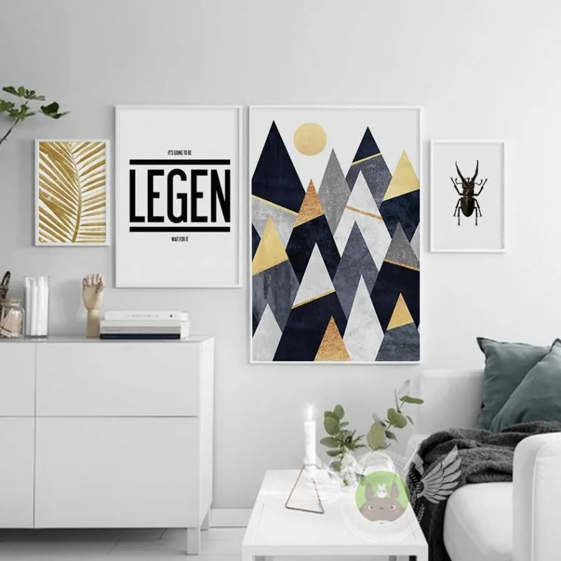 Tranh in canvas Bắc Âu Scandinavian trừu tượng con bọ hung (bọ cánh cứng), lá dừa vàng và những dãi núi hình tam giác phía trên cao là mặt trời kết hợp với chữ LEGEN thích hợp treo ở phòng khách, phòng làm việc, phòng ngủ, quán cà phê, chân cầu thang, bàn học, bàn làm việc…