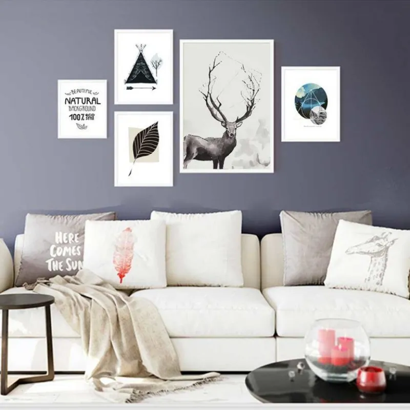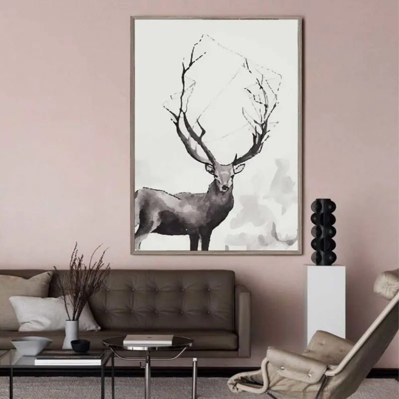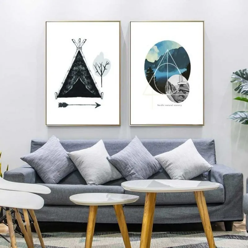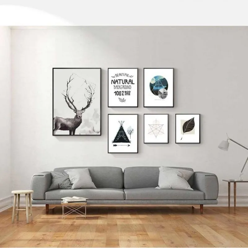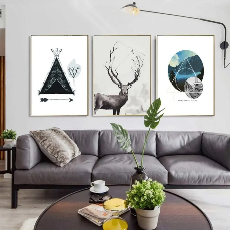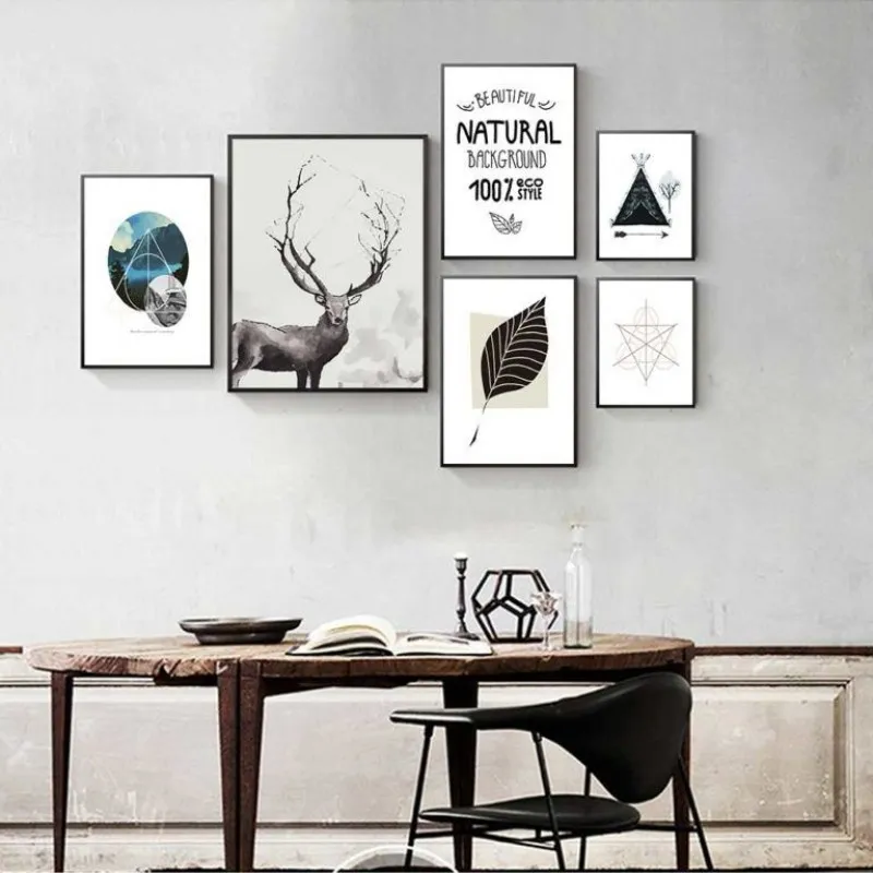 Tranh Bắc Âu Scandinavian trừu tượng hình học, hình tam giác, hình tròn, hình sao 6 cánh, con nai, chiếc lá câyvà chữ Beautiful natural background 100% eco style.