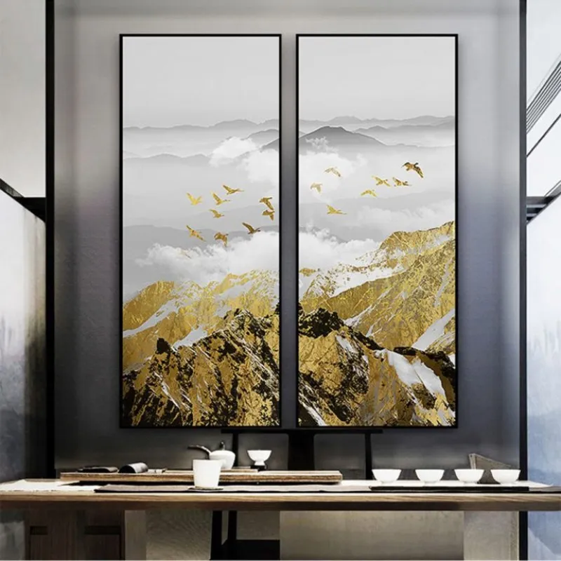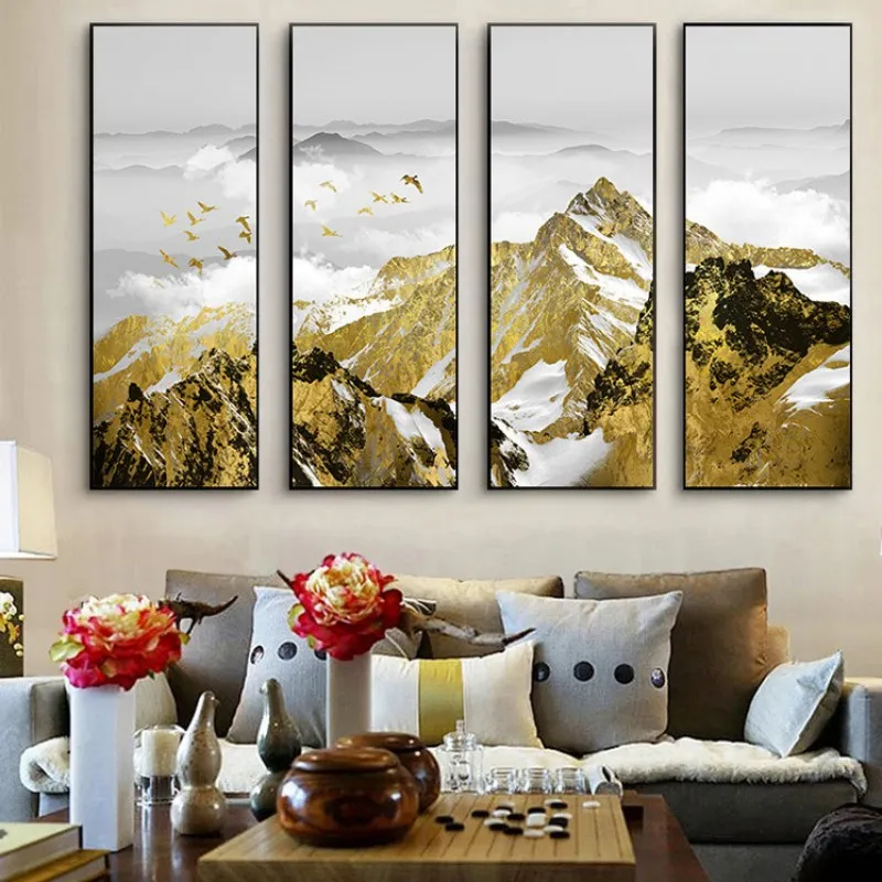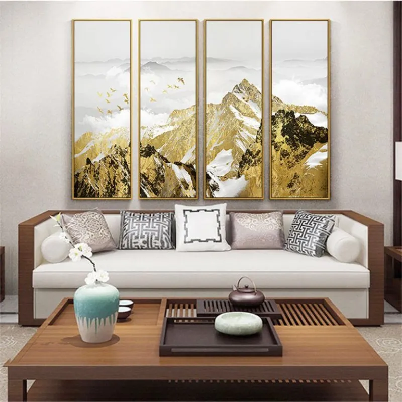 Tranh in canvas phong cảnh núi đồi vàng, bên cạnh đó là đàn chim đang bay, đây là loại tranh mang ý nghĩa sự giàu sang được gọi là núi vàng đồng thời cũng là biểu tượng của sự chắc chắn và ổn định. Với thiết kế màu vàng đơn sắc sẽ làm cho không gian căn phòng có được sự quý phái và vương giả.