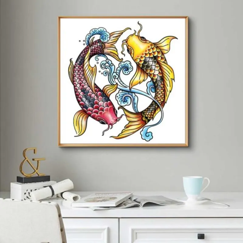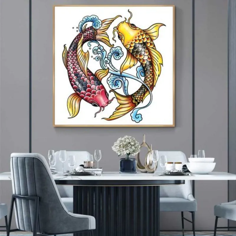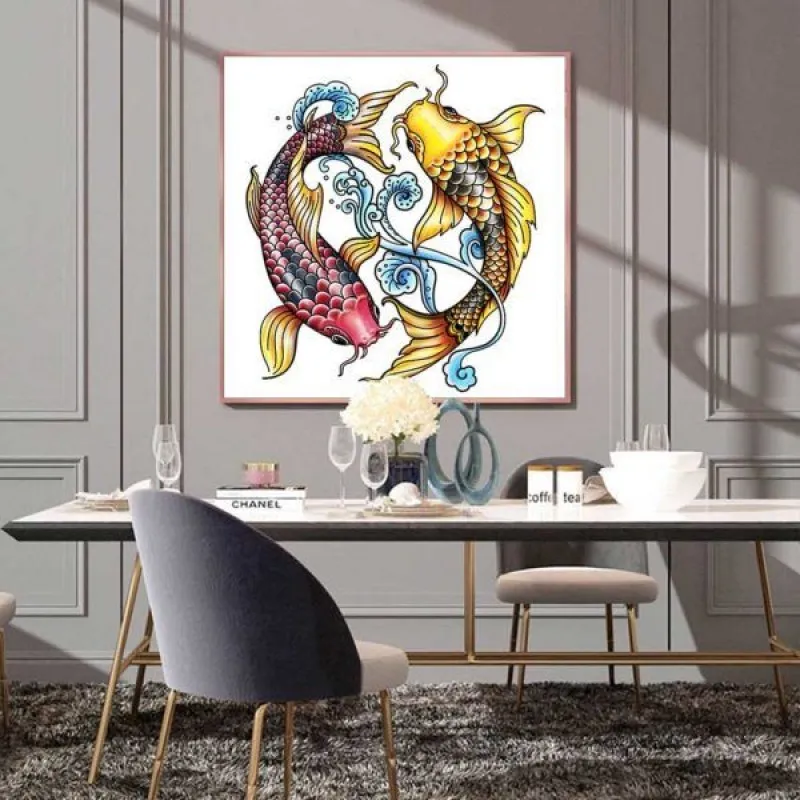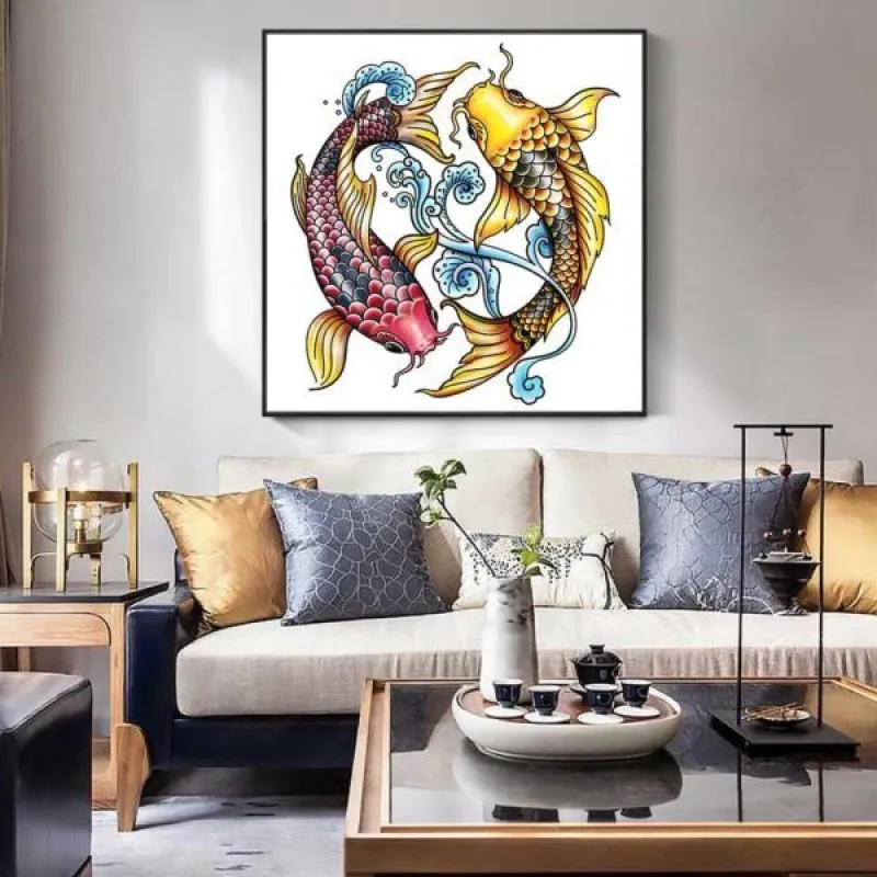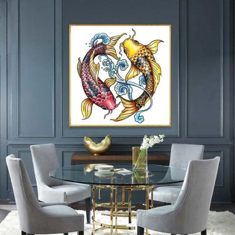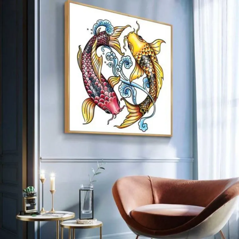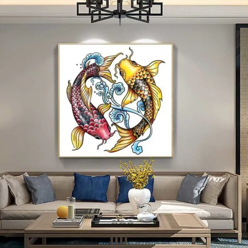Tranh in canvas Song ngư vọng nguyệt hay song ngư tài lộc là một bức tranh với 2 con cá chép hóa rồng khá nổi tiếng trong dòng tranh cá được trang trí theo phong thủy với hai chú cá chép đang uốn mình lượn quanh con sóng nhỏ. Hai chú cá chép đang chuẩn bị vượt Vũ môn để hóa rồng thường mang lại điểm tốt lành và may mắn. Cá chép là biểu tượng cho sự kiên trì, bền chí, linh thiêng,cao quý. . Trong làm ăn buôn bán thì cá chép đại diện cho Thuỷ khí tức là nguồn tài lộc dồi dào.