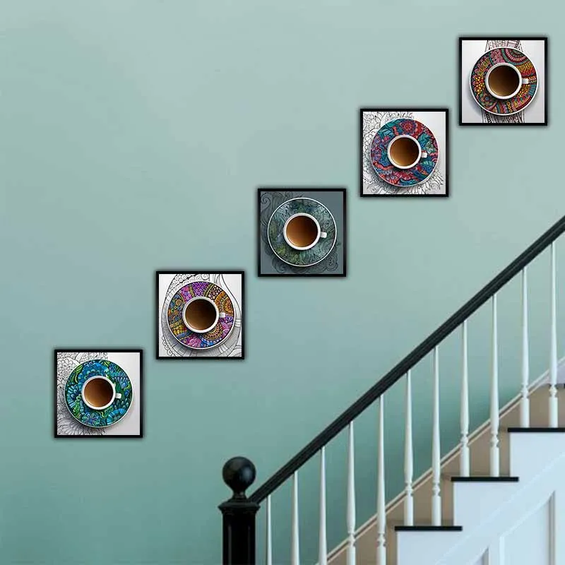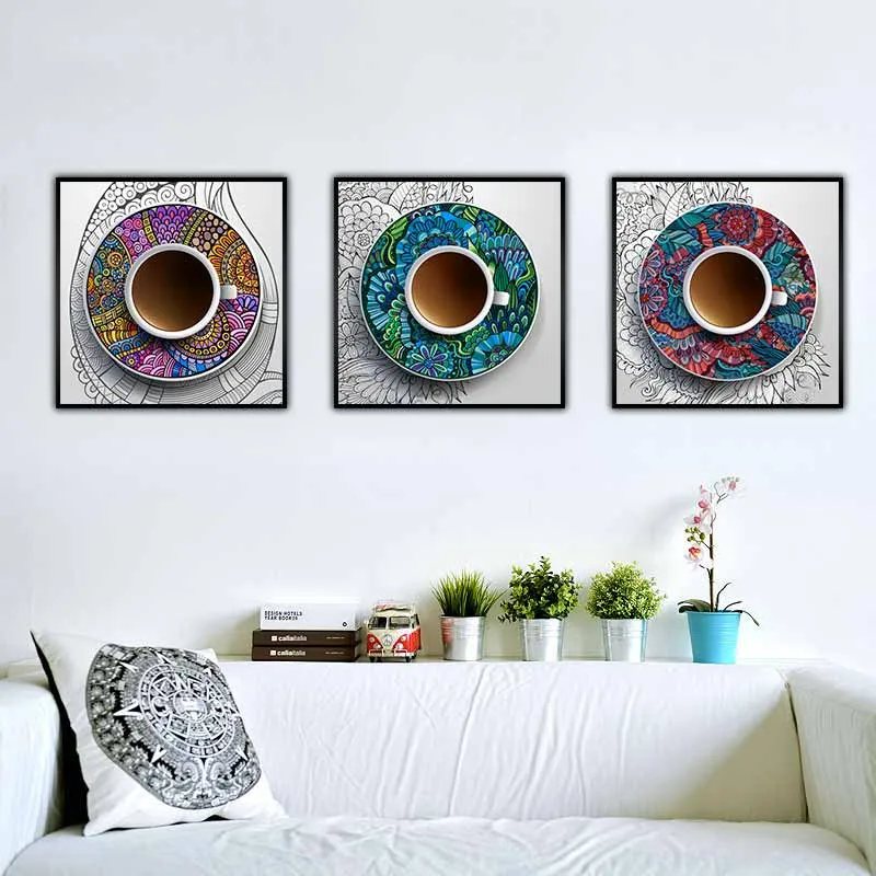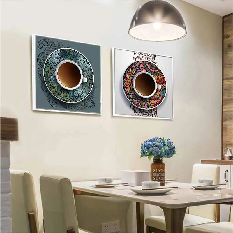 Tranh tách cà phê đặt trên đĩa trang trí hoa văn nhiều màu sắc treo quán cà phê