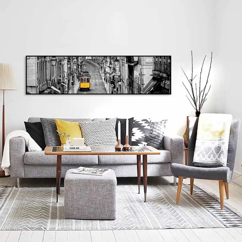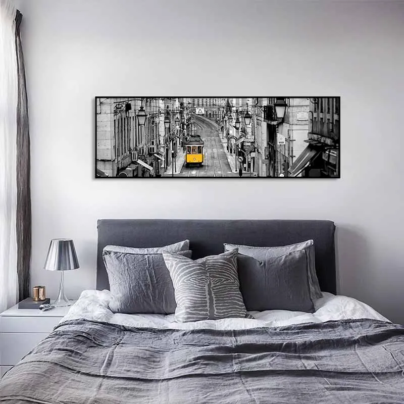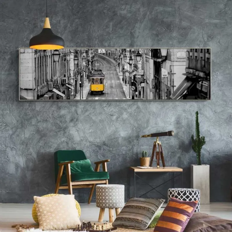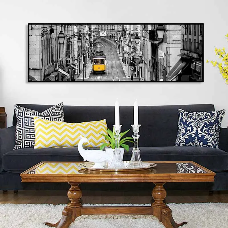 Tranh thành phố cổ đen trắng và xe điện màu vàng