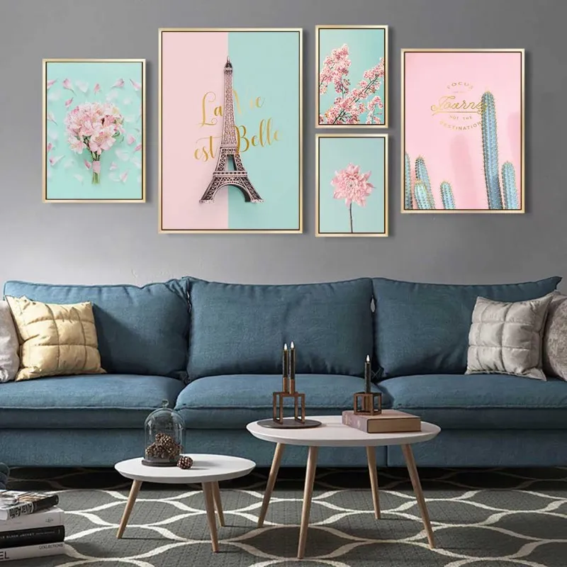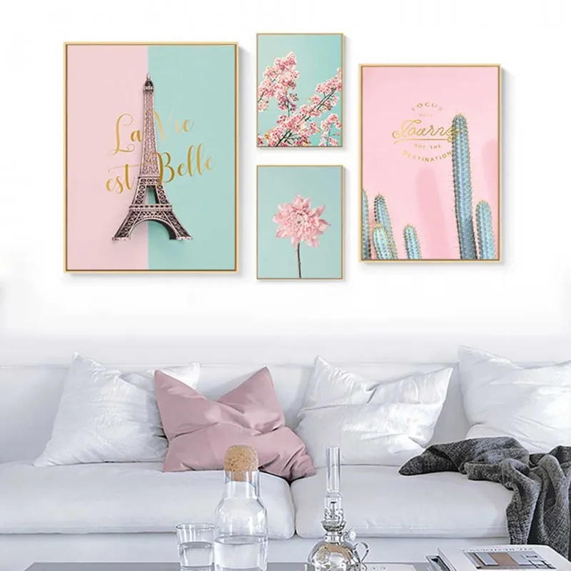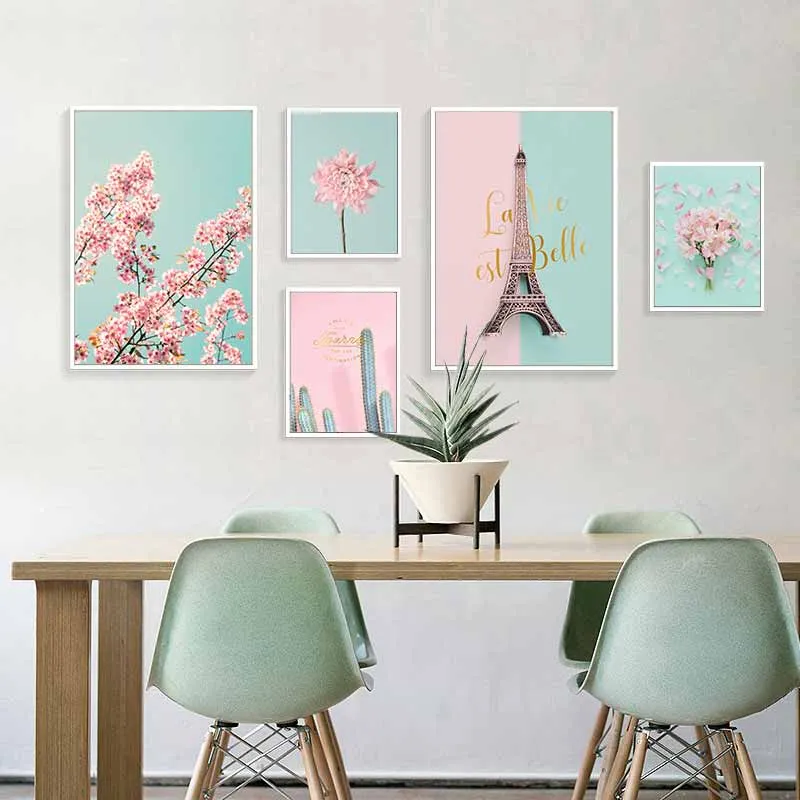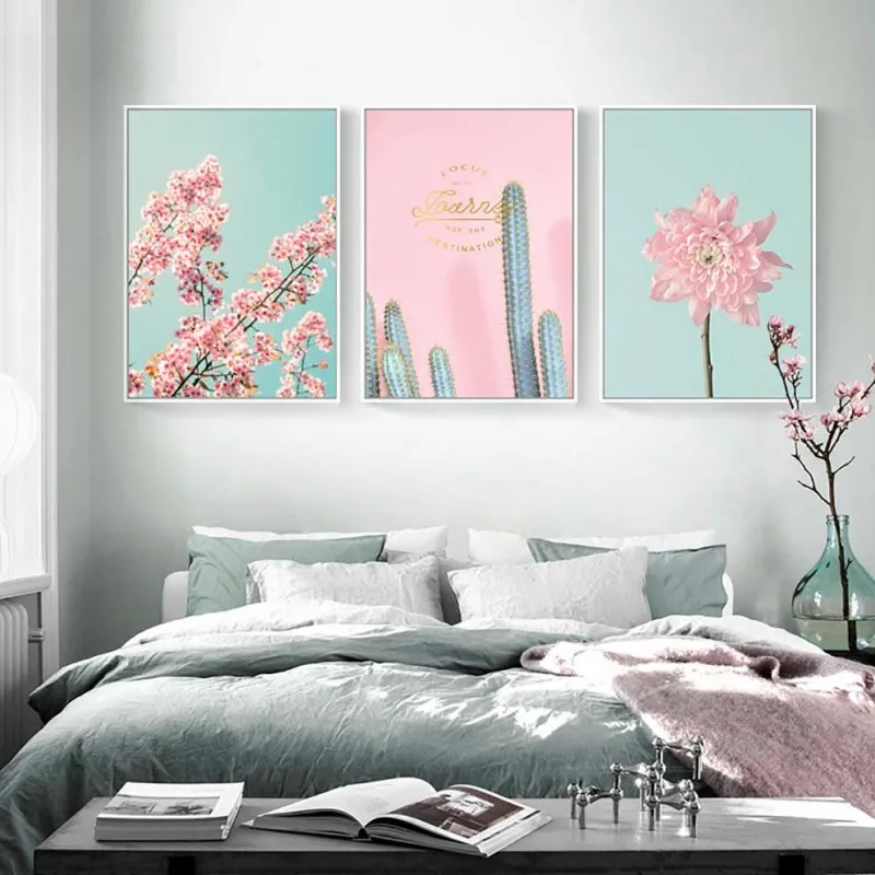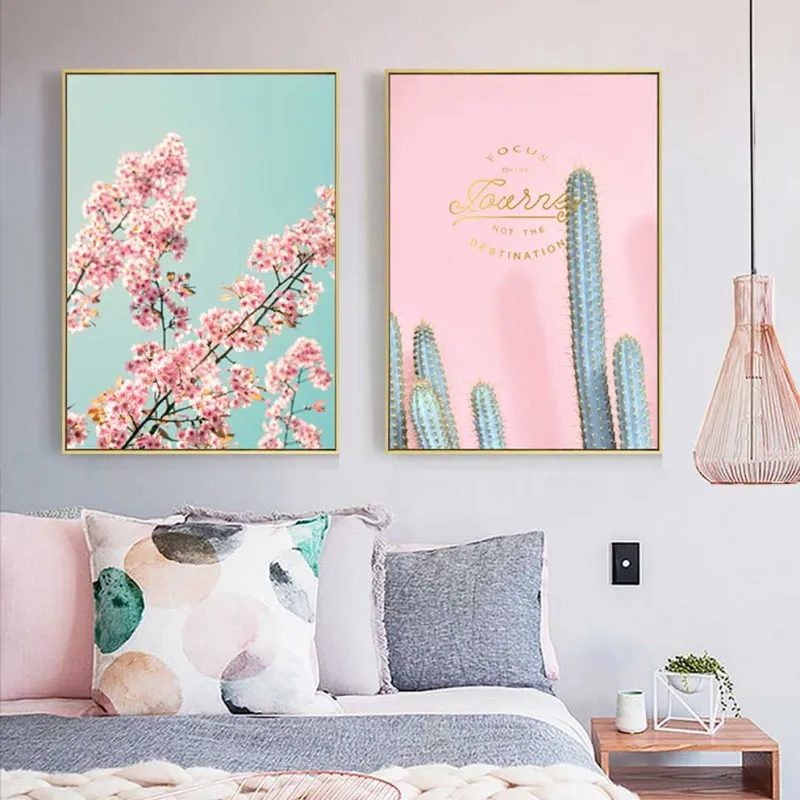 Tranh in canvas Bắc Âu Scandinavian những bông hoa đầy màu sắc kết hợp chữ La Vie est Belle, cây xương rồng kết hợp với chữ Focus on the journey not the destination.