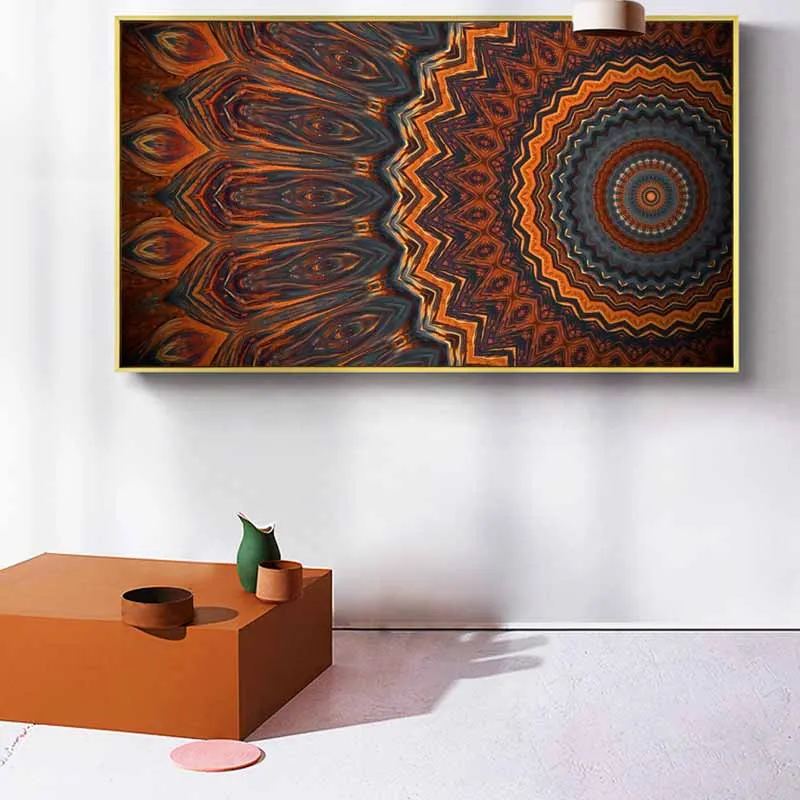 Bức tranh "Mandala": Đây là một biểu tượng của Ấn Độ và Phật giáo, được cho là có khả năng biểu hiện sự hài hòa giữa vũ trụ và con người. Bức tranh này sử dụng các màu sắc tươi sáng và rực rỡ như đỏ, cam, vàng và xanh để tạo ra một không gian sinh động và năng động. Bạn có thể treo bức tranh này ở phòng làm việc hoặc phòng ăn để mang lại cảm giác hứng khởi và sáng tạo.