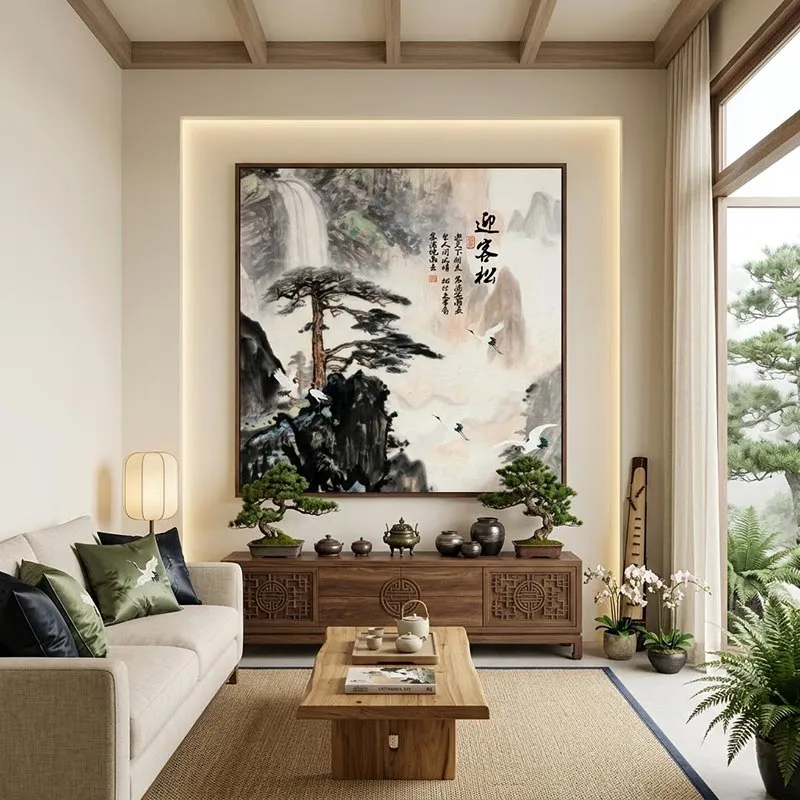 Lý do: Bức tranh "Nghênh Khách Tùng" (Welcoming Pine) mang ý nghĩa đón tiếp khách quý với sự trọng thị và hiếu khách. Đây là vị trí lý tưởng nhất để thể hiện sự chào đón của gia chủ. Hơn nữa, khung cảnh hùng vĩ và sang trọng của tranh sẽ tạo nên điểm nhấn ấn tượng cho không gian sinh hoạt chung này.