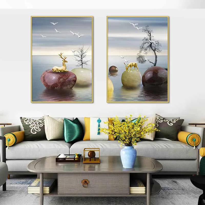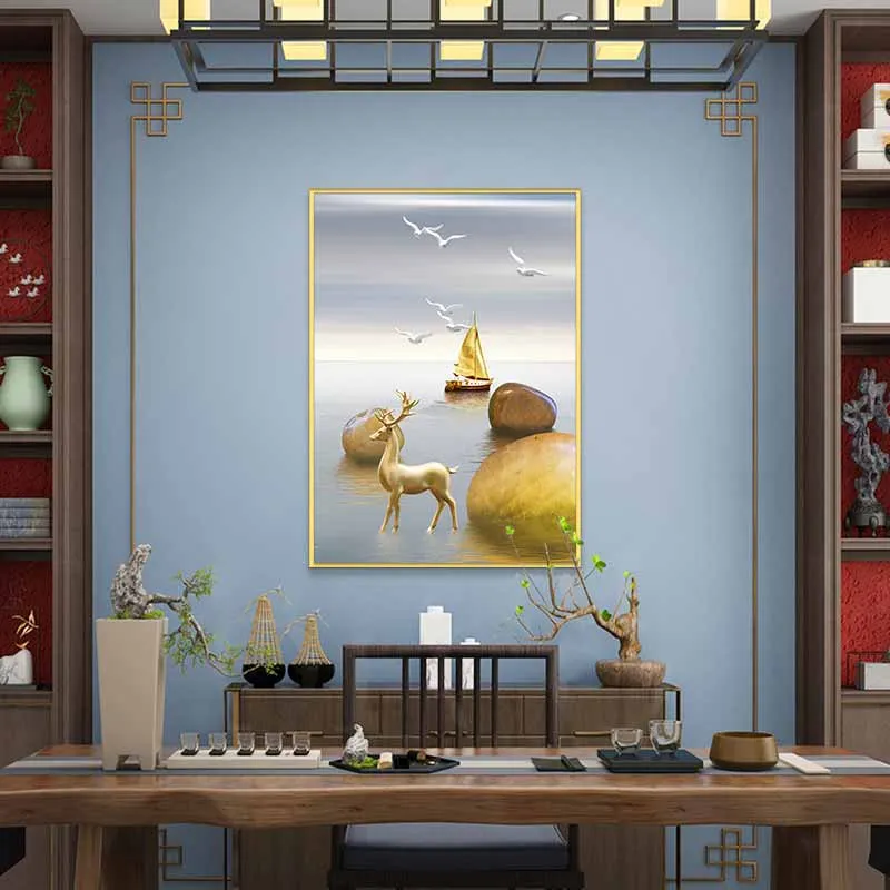 Tranh thuyền buồm và đàn nai vàng đứng trên những tảng đá trừu tượng