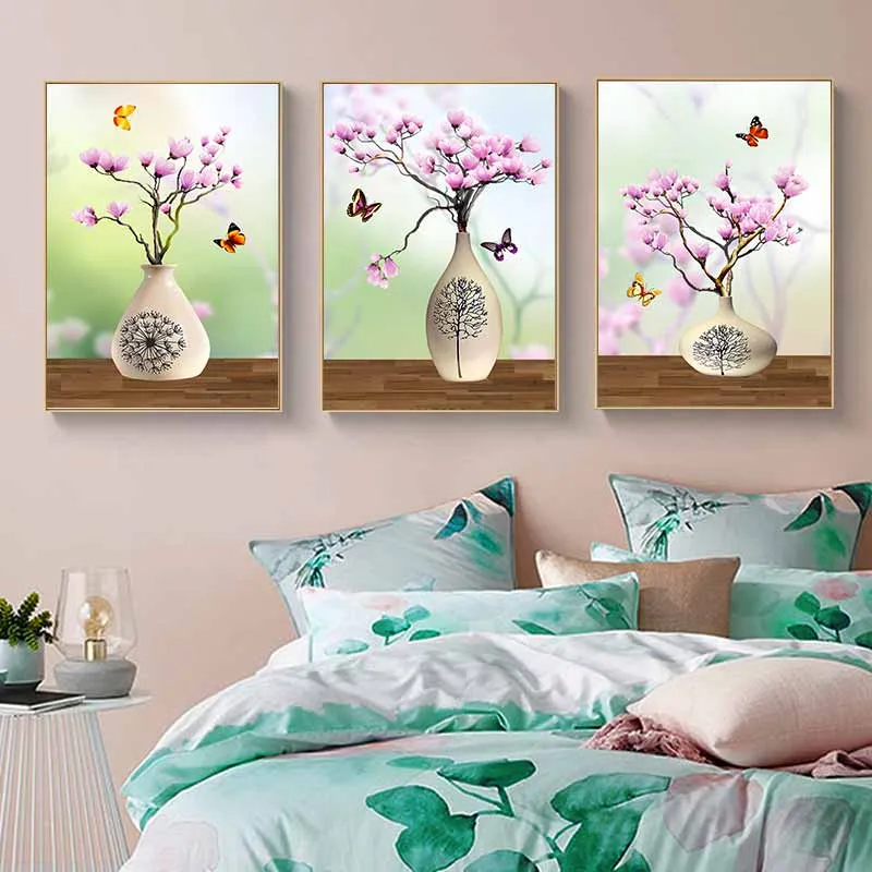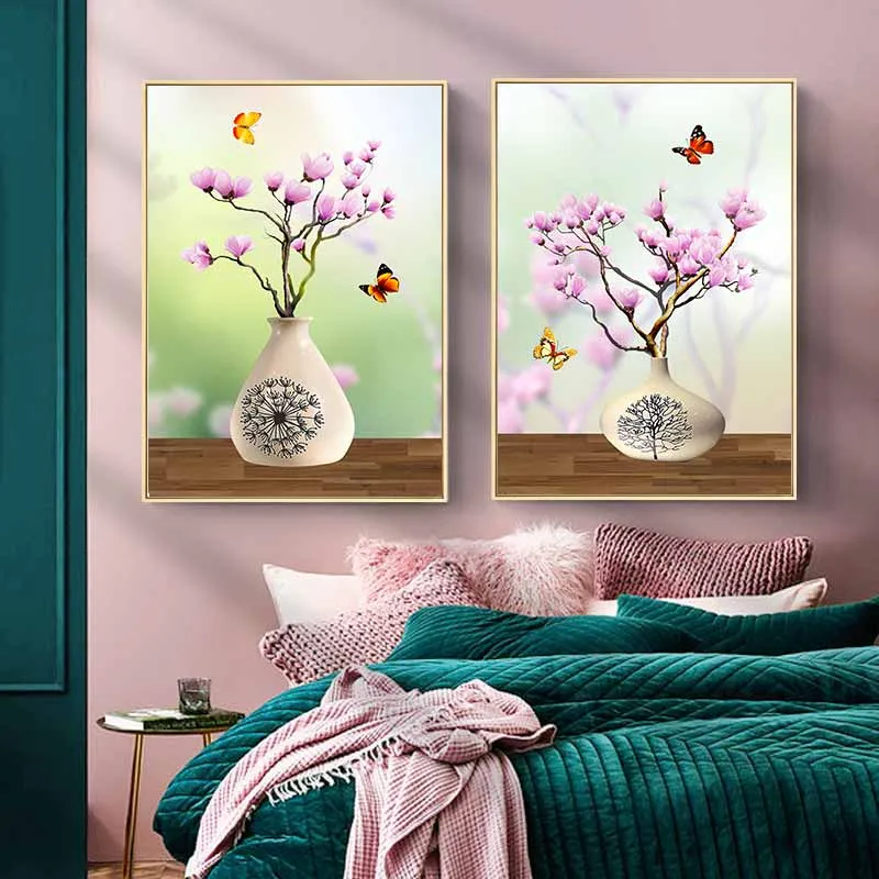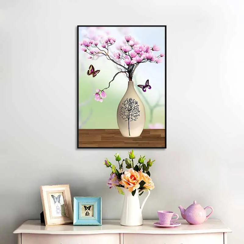 Tranh tĩnh vật bình gốm trắng hoa anh đào và đàn bướm