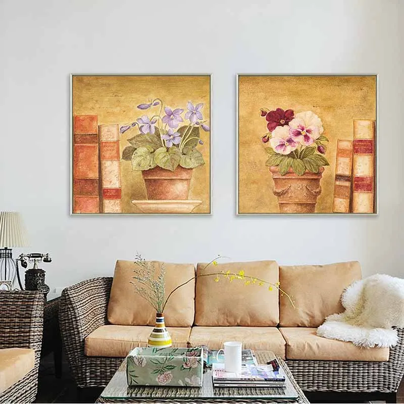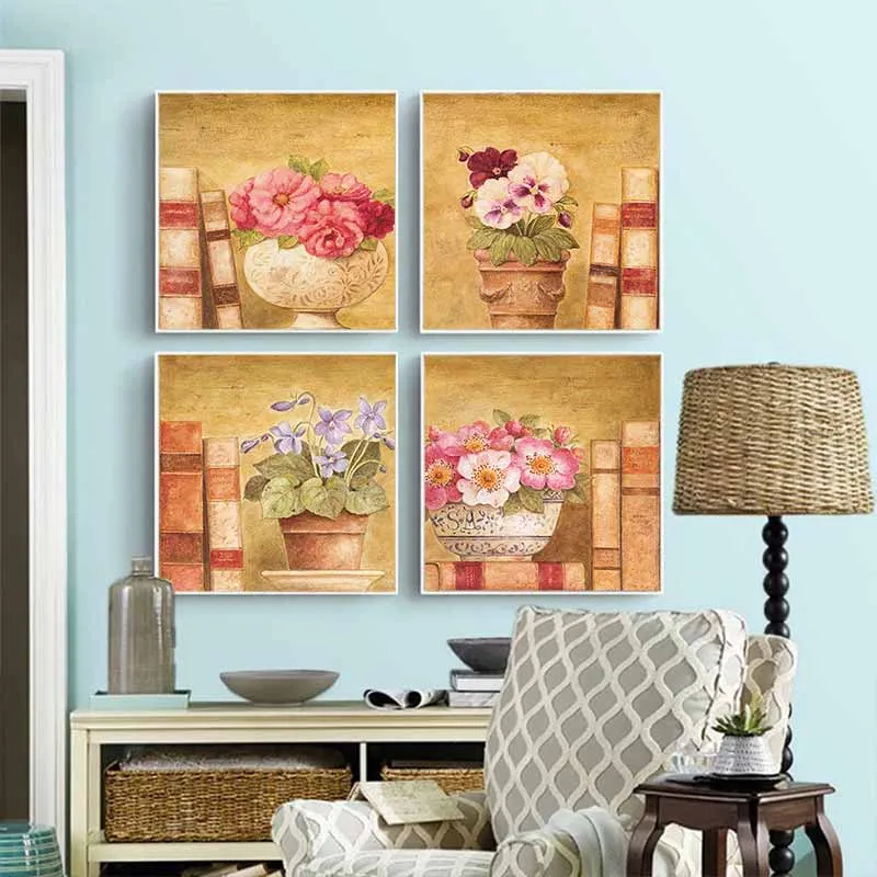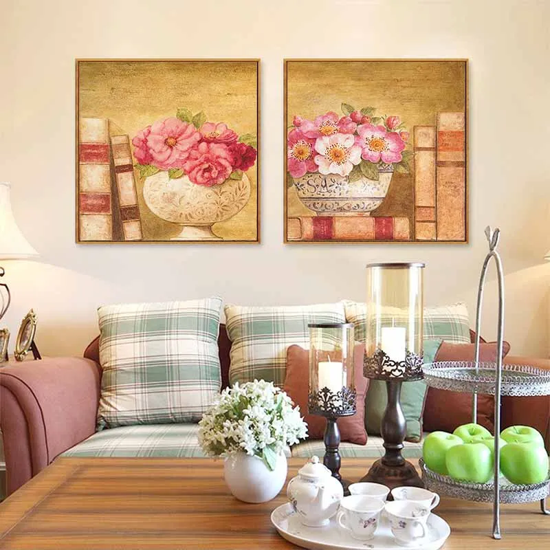 Tranh tĩnh vật bình hoa đặt trên kệ bên cạnh những cuốn sách