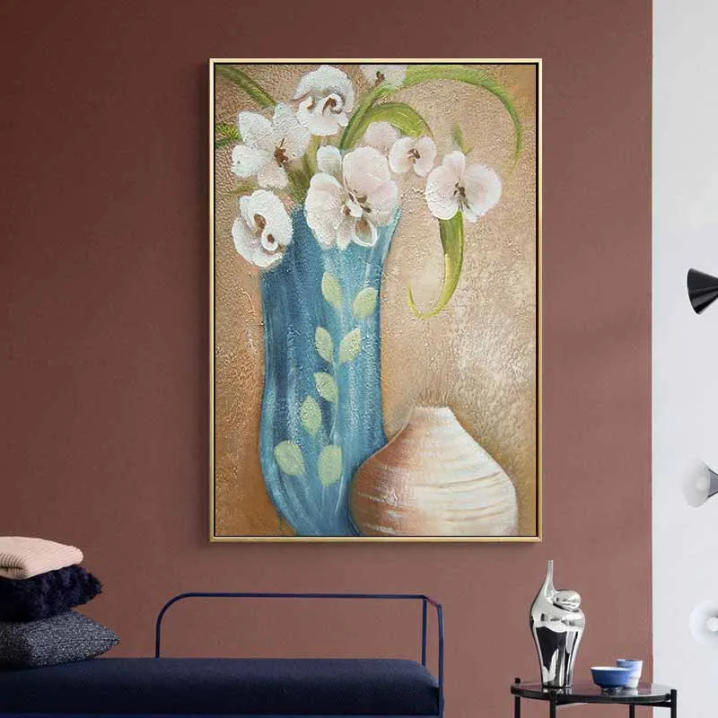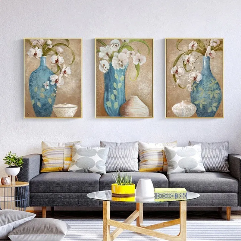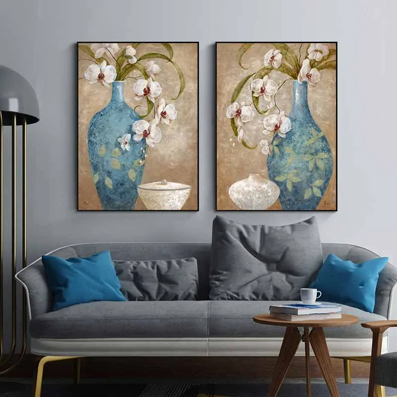 Bộ tranh hoa phong lan Hồ Điệp, kết hợp với bình màu xanh trên nền nâu làm cho bình hoa thêm nổi bật.
