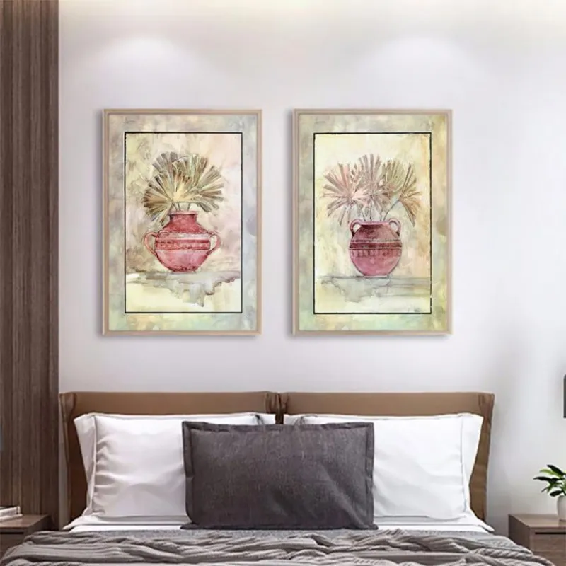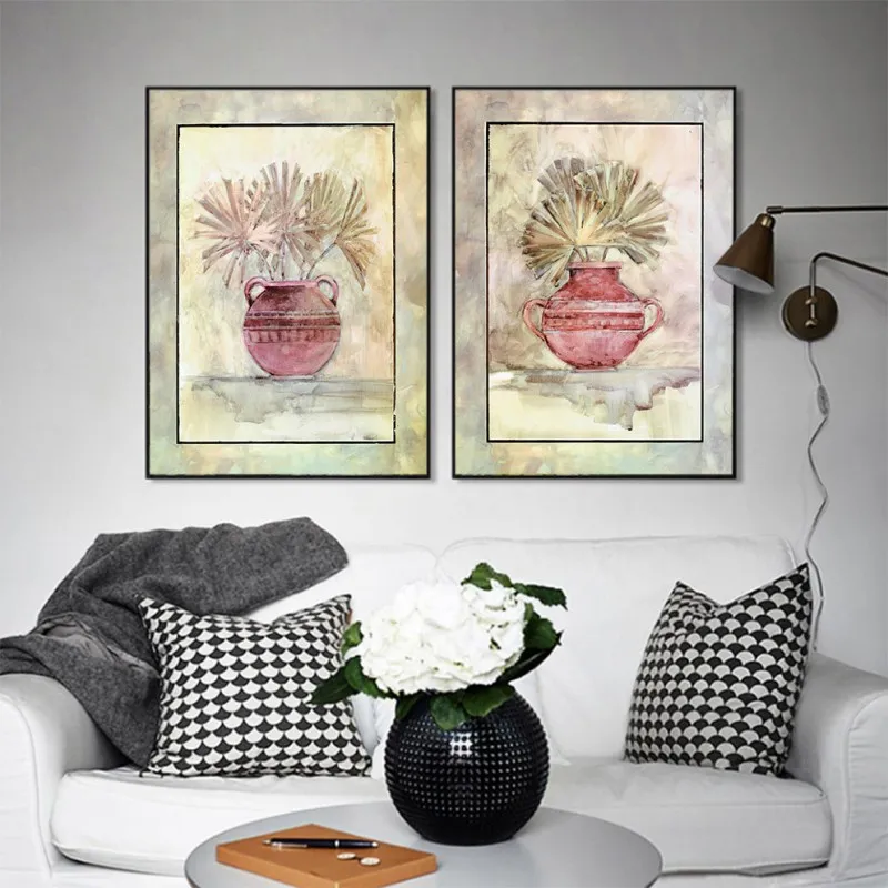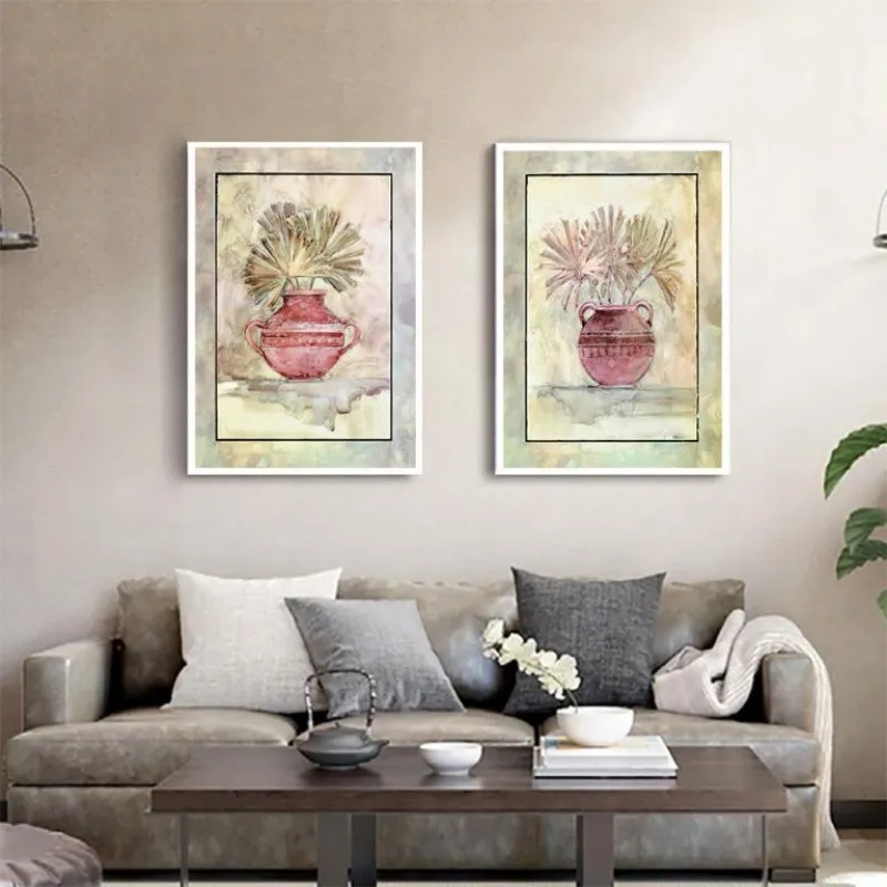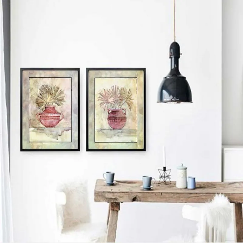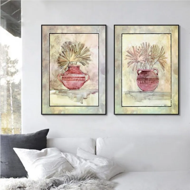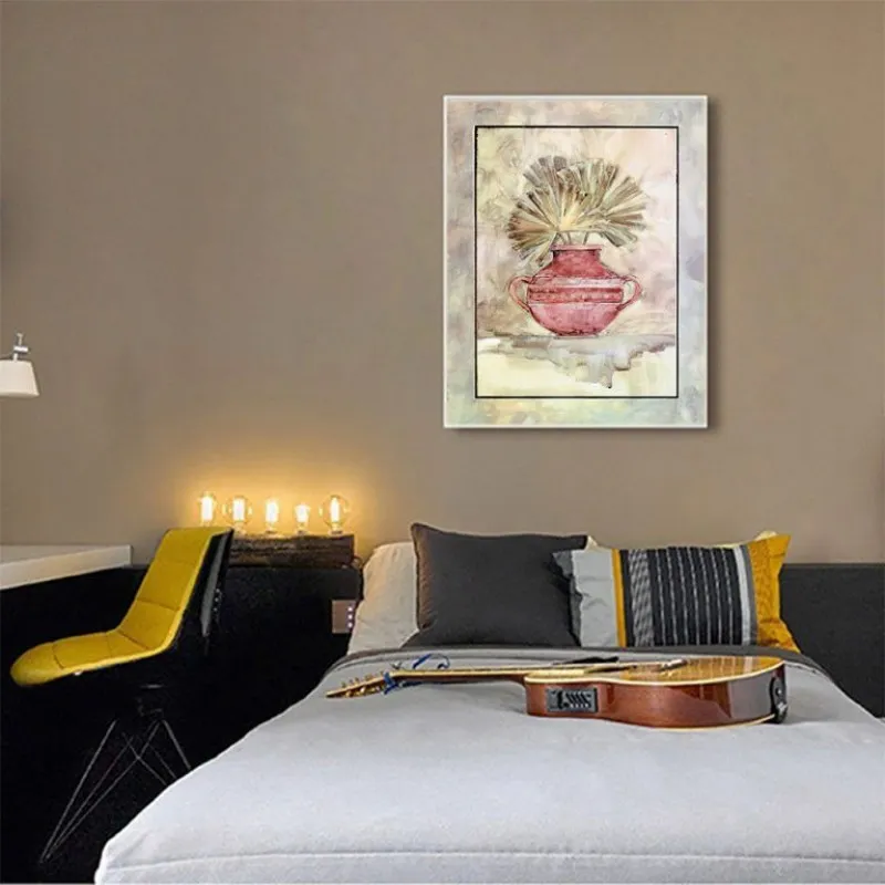 Tranh in canvas tĩnh vật bình hoa và lá cọ.