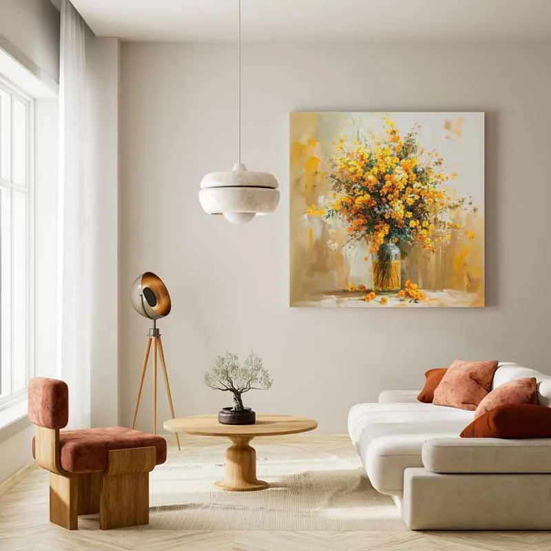 Phòng khách: Đây là lựa chọn lý tưởng cho phòng khách, nơi bức tranh có thể trở thành tâm điểm, mang lại nguồn năng lượng tươi mới và sự ấm áp cho không gian sinh hoạt chung. Màu vàng rực rỡ của hoa sẽ làm bừng sáng căn phòng.