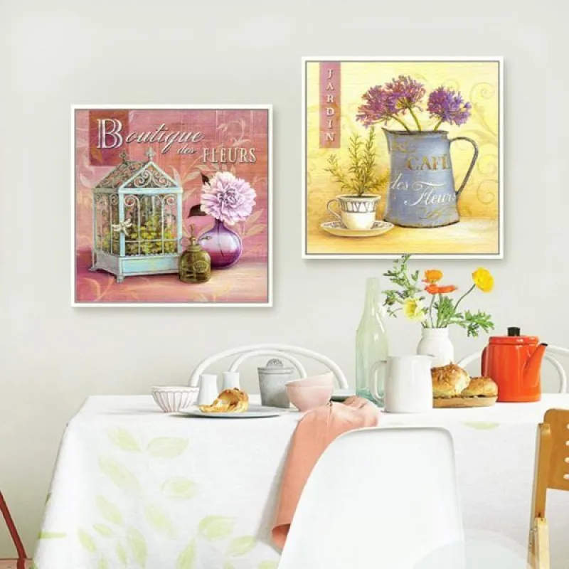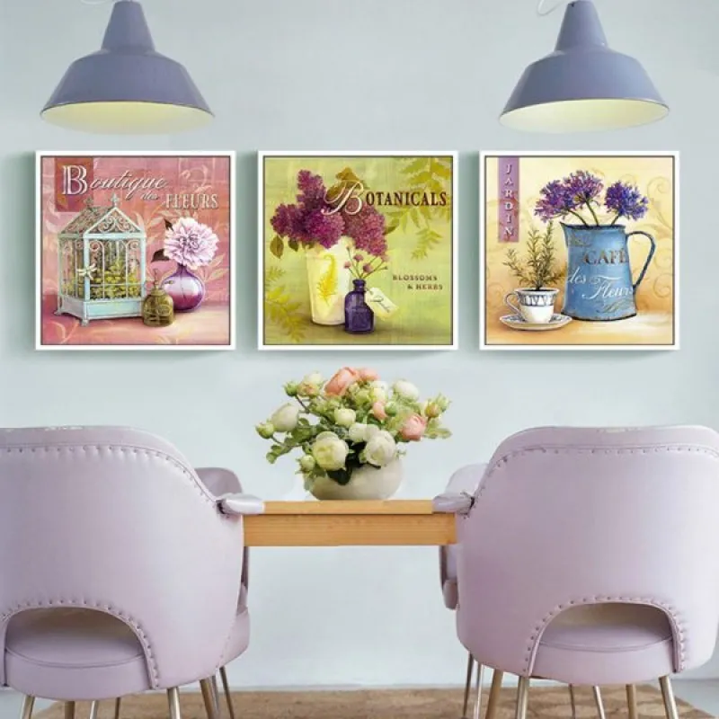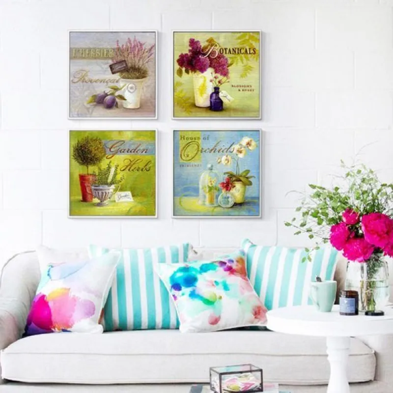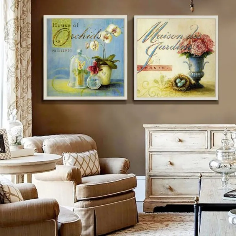 Tranh in canvas những chậu hoa hồng, hoa lan, cỏ thảo mộc… kết hợp chữ boutique des fleurs, jardin cafe des fleurs, maison des jardins, fleurs de provence, L’herbier provencal, botanicals blossoms a herbs, garden herbs, house of orchids printemps
