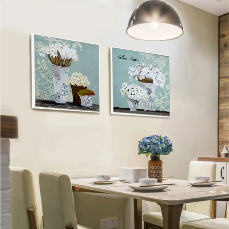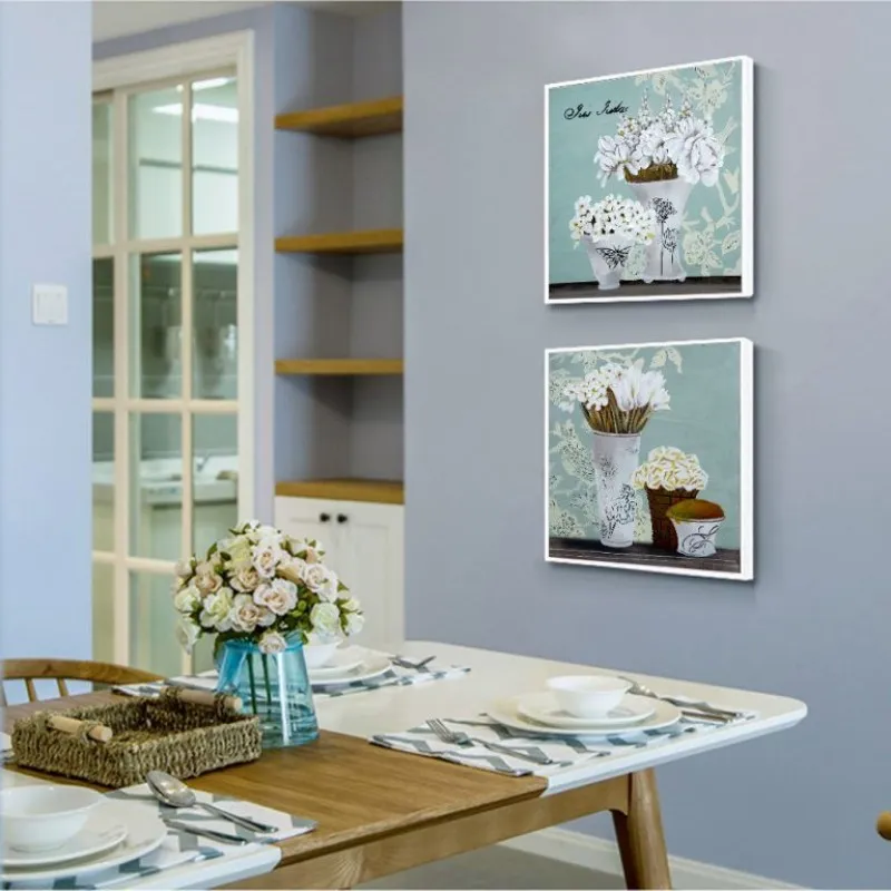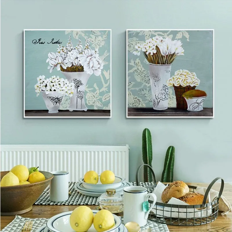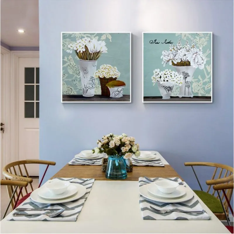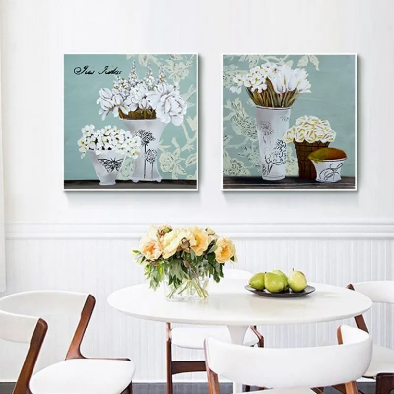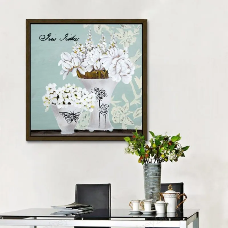 Tranh in canvas tĩnh vật hoa màu cúc trắng tuyệt đẹp được bố cục từ cao đến thấp như thứ tự trong một bức tranh cho ta thấy sự chặt chẽ trong cách sắp xếp, phía sau là nền hoa văn nhưng chỉ chiếm 1 nửa phông nền giúp cho bình hoa có một điểm dựa chắc chắn (do chậu hoa có chân khá nhỏ thường cho người xem có cảm giác mong manh dễ vỡ). Ngoài ra trên chậu hoa có thêm hoa văn màu đen cũng giúp phá vỡ đi tính đơn điệu của bức tranh.
