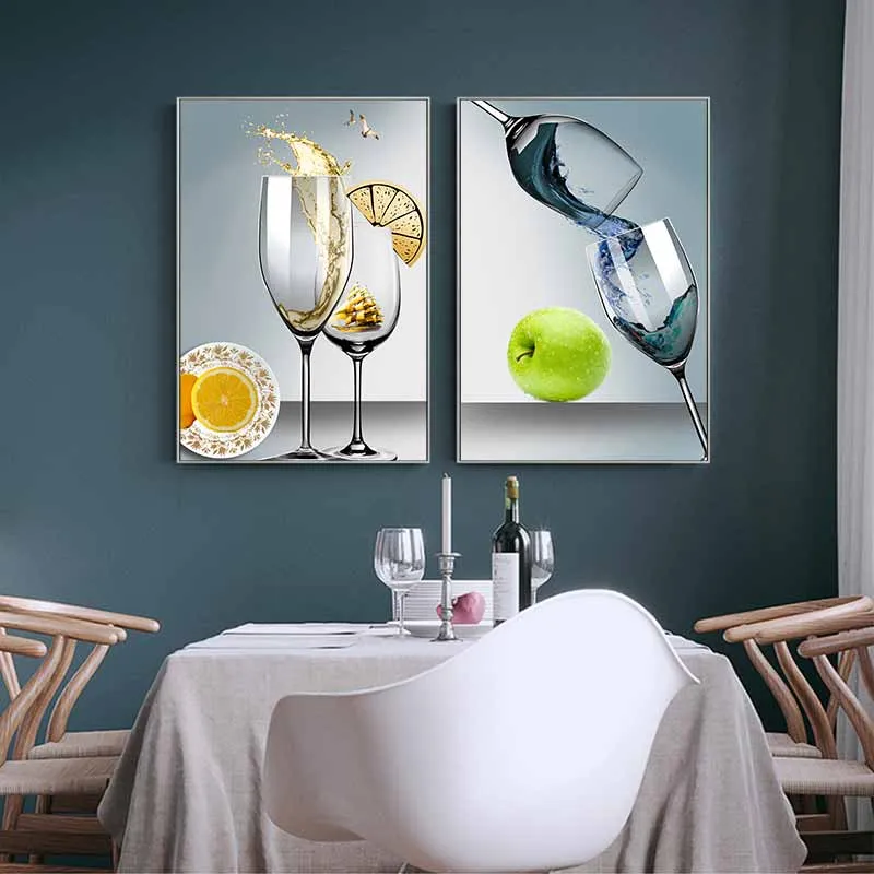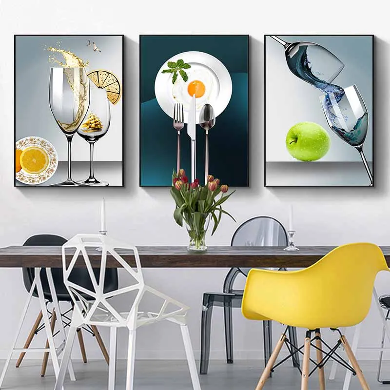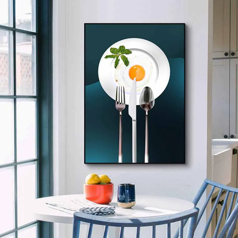 Tranh trang trí hiện đại ly nước cam đĩa trứng ốp la và quả táo xanh