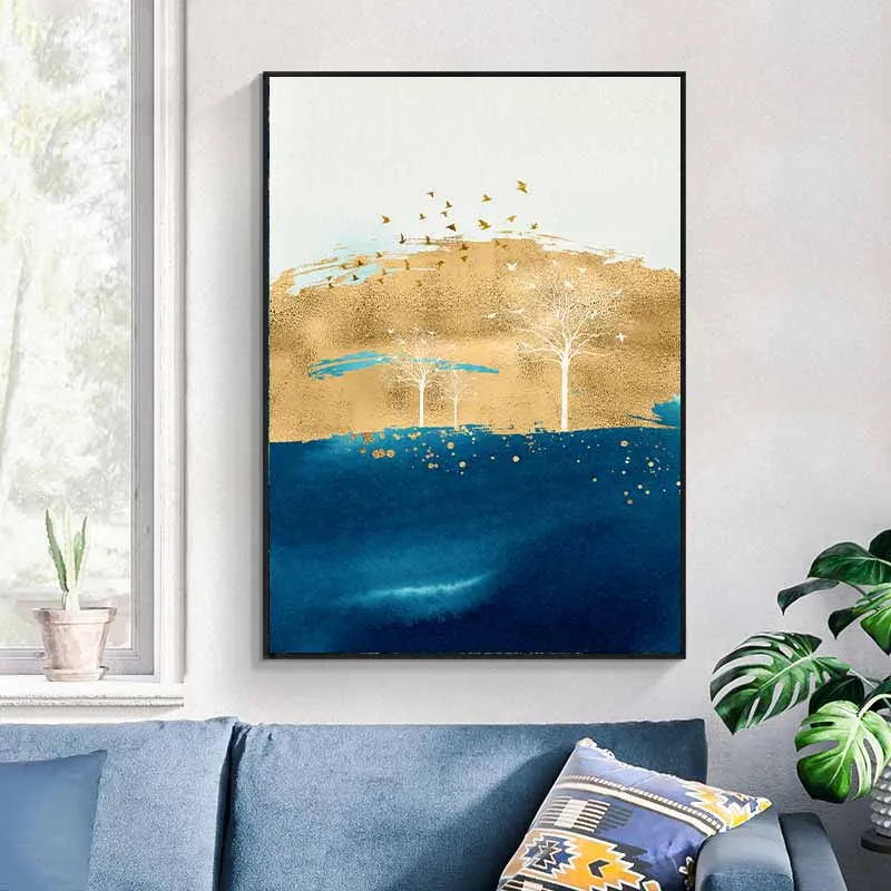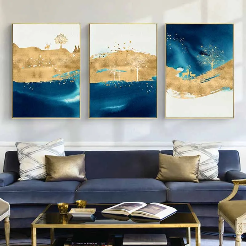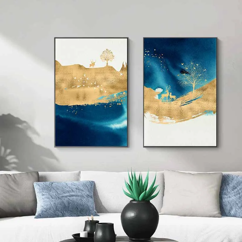 Tranh trừu tượng 2 mảng màu xanh đậm và vàng cùng những chi tiết con nai, đàn chim