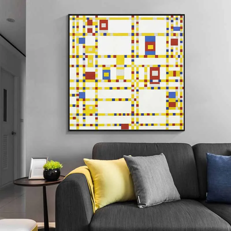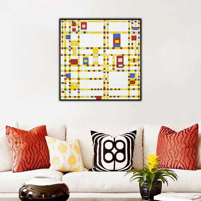 Bức tranh này được vẽ bởi Piet Mondrian, một họa sĩ trừu tượng nổi tiếng với phong cách neo-plasticism, chỉ sử dụng các màu sắc cơ bản và các đường thẳng vuông góc. Bức tranh là cảm hứng từ âm nhạc jazz và sự sống động của thành phố New York. Bức tranh gồm các ô vuông nhỏ màu vàng, xanh và đỏ, xen kẽ với các đường thẳng màu trắng và xám, tạo ra hiệu ứng chuyển động và nhịp điệu.