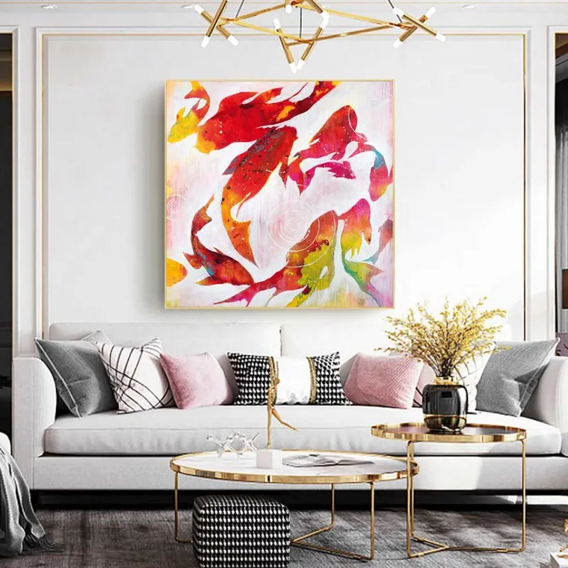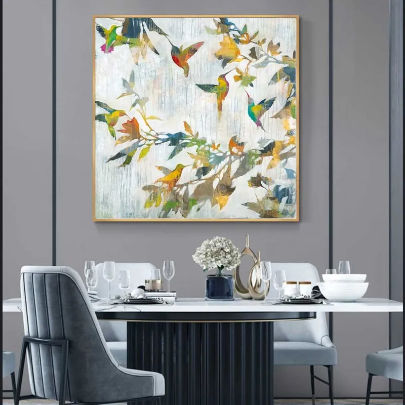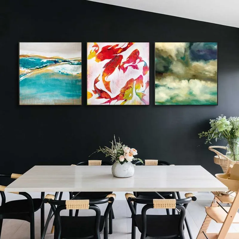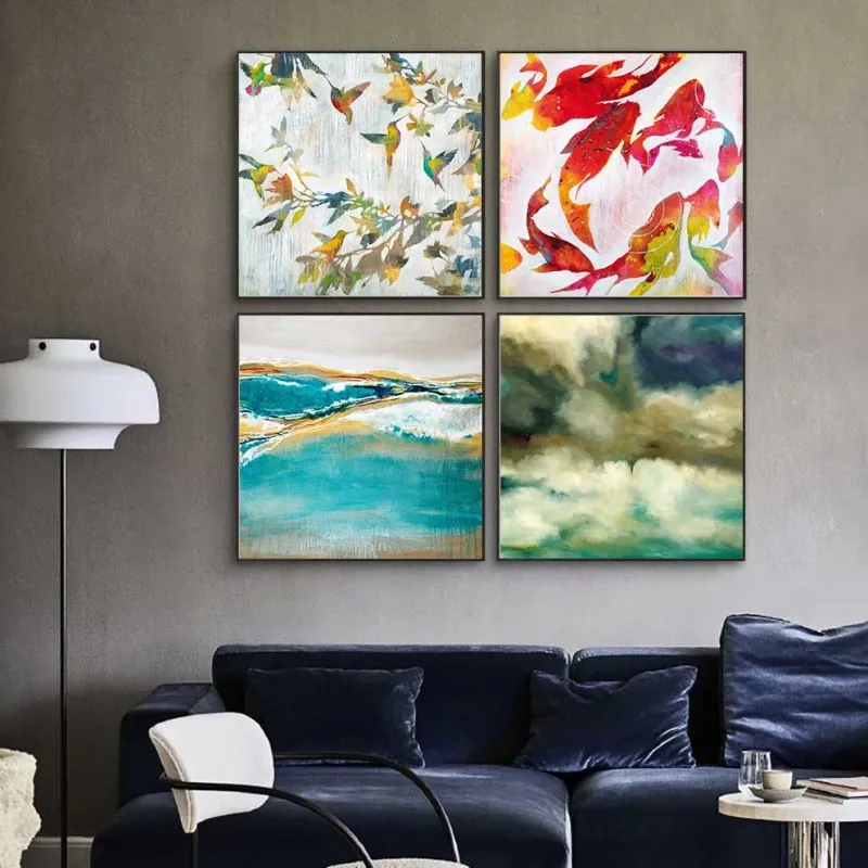 Tranh in canvas trừu tượng những chú cá chép, bầy chim ruồi, chim hút mất, cùng sóng biển và mây trời. Tranh thích hợp khí kết hợp nhiều tấm và treo ở phòng khách, phòng làm việc, phòng ngủ, quán cà phê, chân cầu thang, bàn học, bàn làm việc…