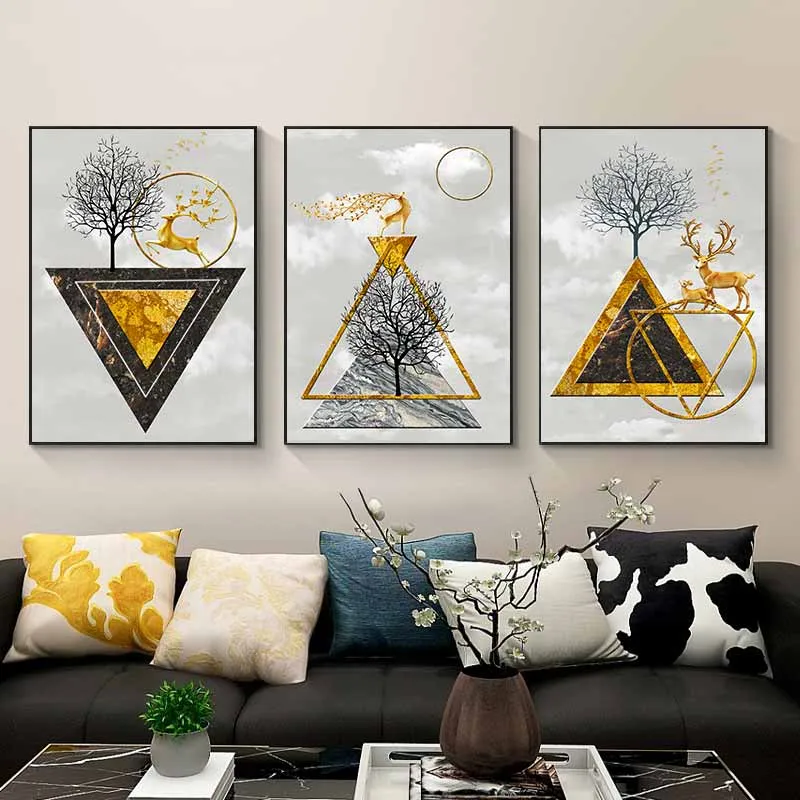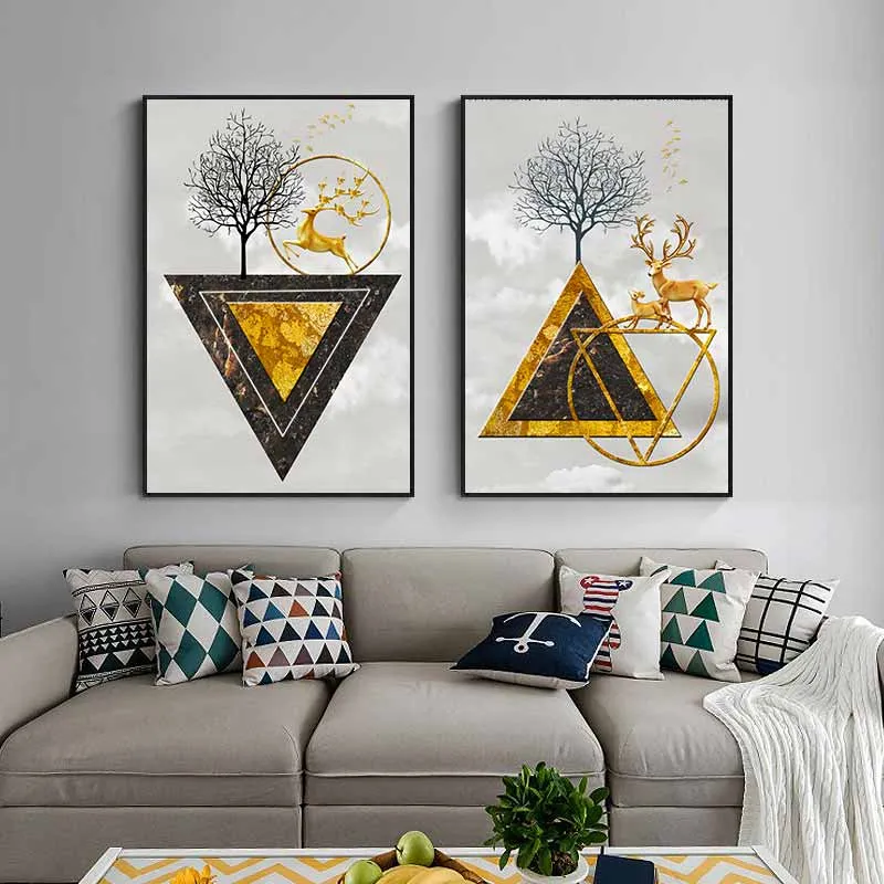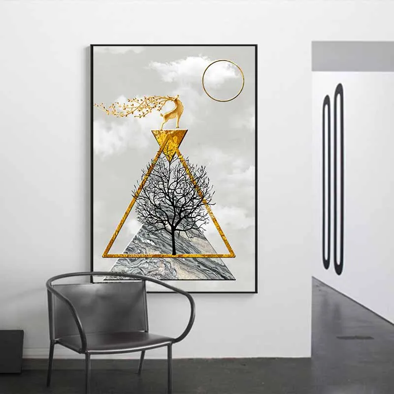 Tranh trừu tượng các khối hình học tam giác, hình tròn và đàn nai cách điệu