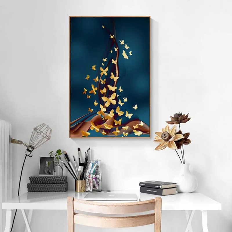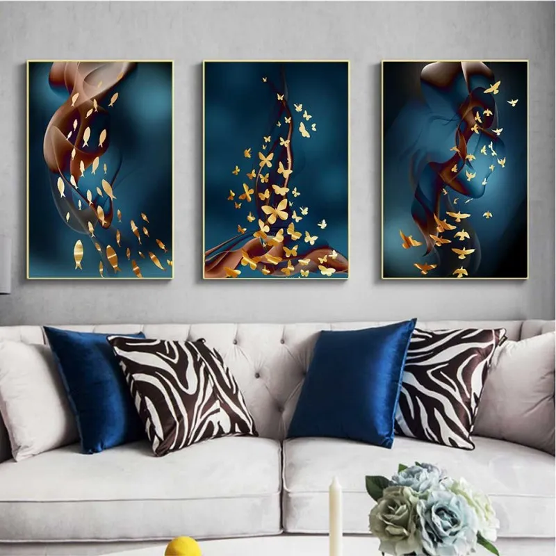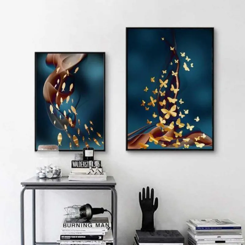 Tranh đàn chim, đàn cá và đàn bướm thuộc thể loại tranh trừu tượng có màu chủ đạo là xanh nước biển với những điểm nhấn là màu vàng (gold) và nâu. Bộ tranh mang ý nghĩa về tài lộc và sự phát triển luôn vươn lên qua hình ảnh được thể hiện bởi đàn chim, đàn cá, đàn bướm bay hướng lên trên.