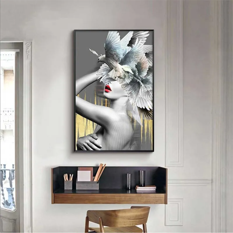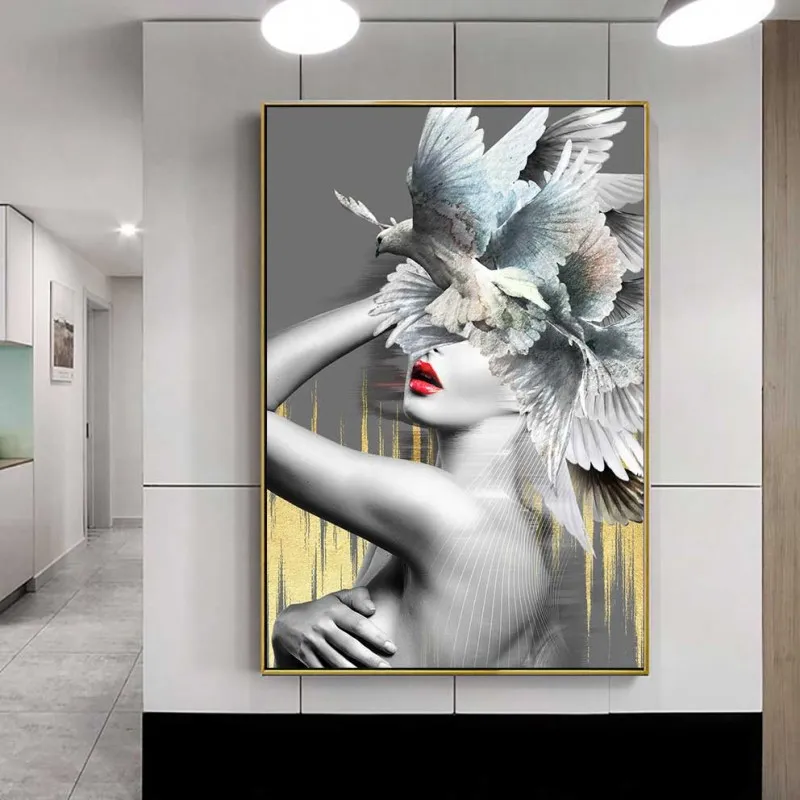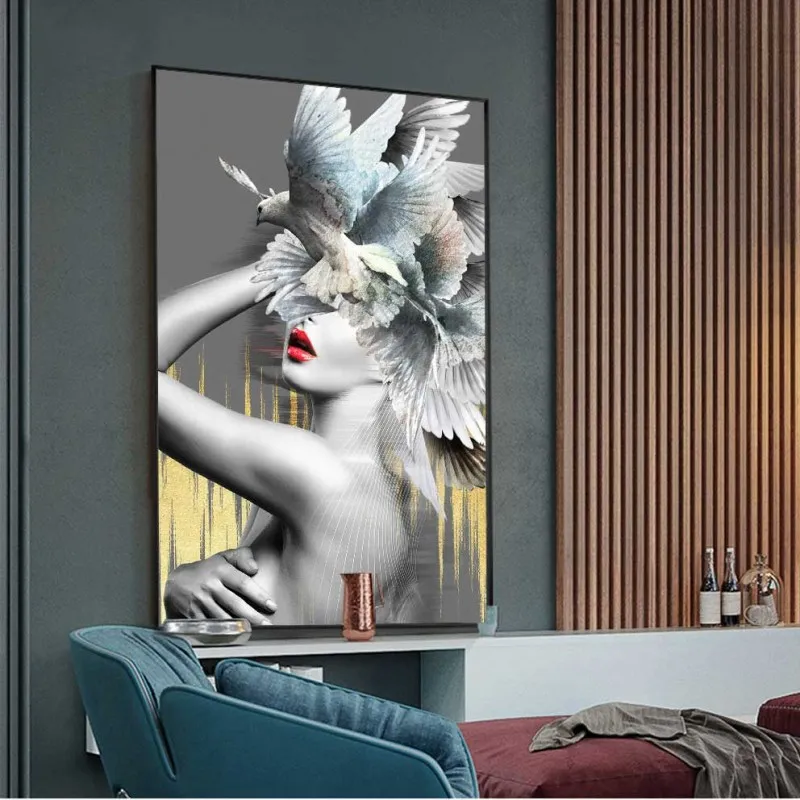 Tranh trừu tượng cô gái khỏa thân nude và đàn chim bồ câu tôn lên vẻ đẹp thân hình gợi cảm của người phụ nữ, đàn chim bồ câu như là chiếc nón lông vũ che nửa mặt cũng là một phong cách thời trang hiện đại mà các người mẫu thường thực hiện trong các buổi biểu diễn thời trang thời nay.