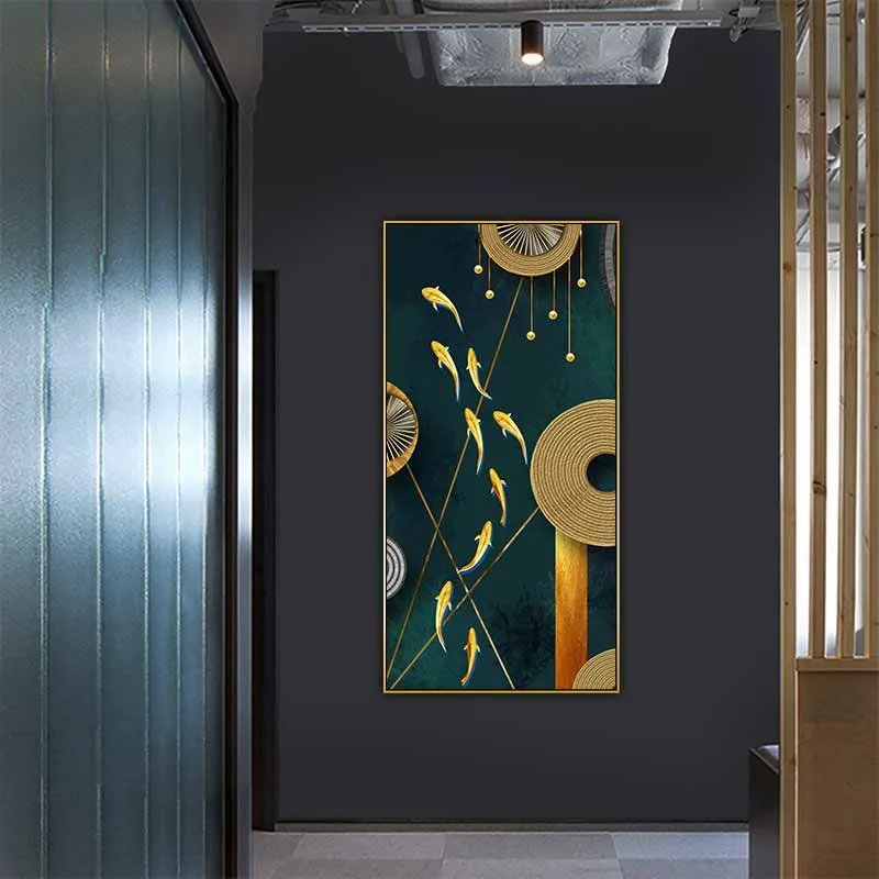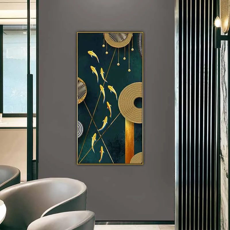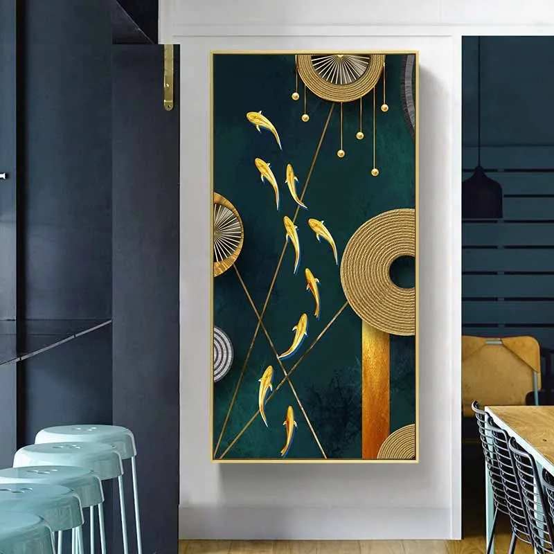 Tranh trừu tượng cửu ngư với những vòng tròn và đường nét thẳng