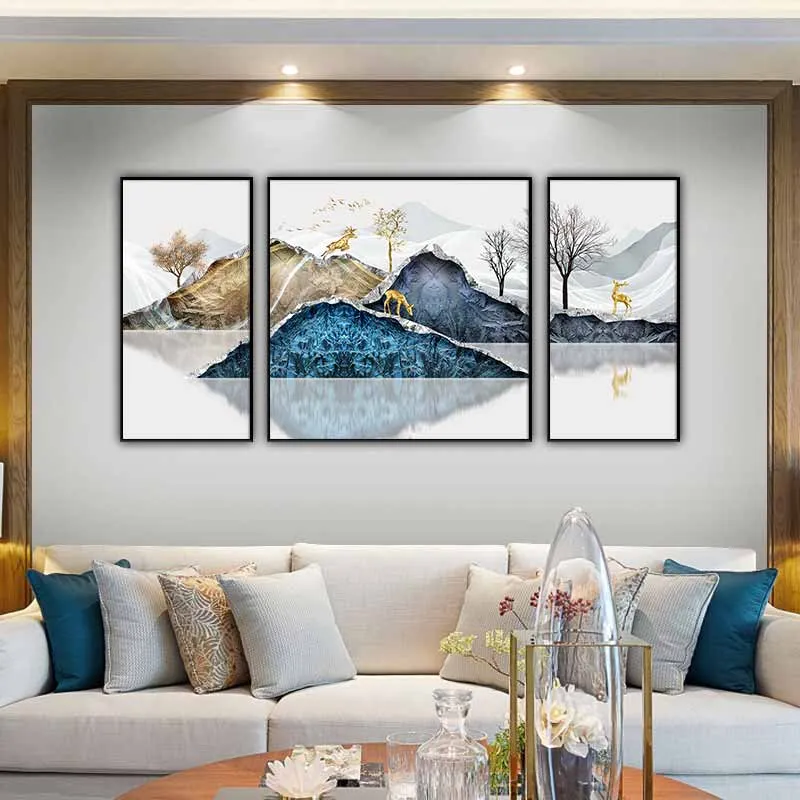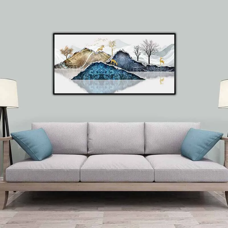 Tranh trừu tượng đàn nai đang chạy nhảy trên những ngọn núi
