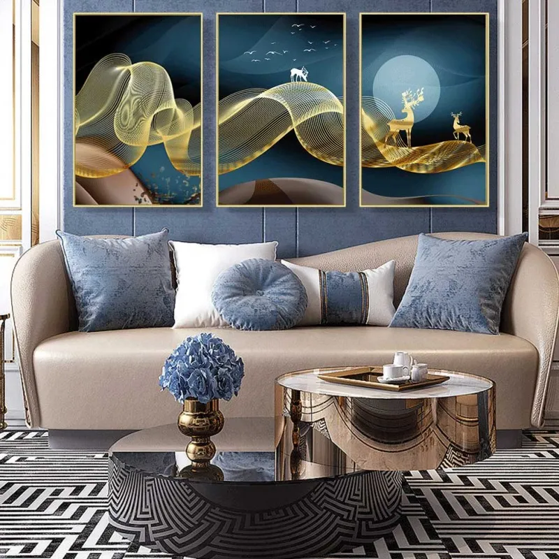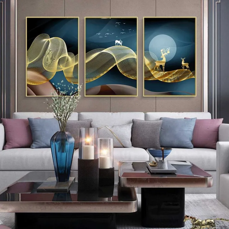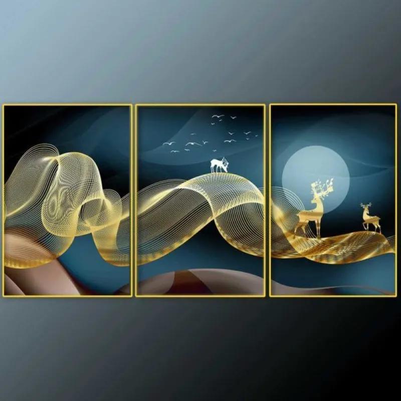 Tranh in canvas phong cảnh trừu tượng đàn nai vàng đứng trên một dải trừu tượng như những ngọn núi cao. Đây là thể loại tranh phong thủy nai và đàn chim tượng trưng cho sự bổng lộc và vươn cao đối với những người kinh doanh hay làm công chức. Tranh phù hợp treo phòng khách, văn phòng công ty hay trong khách sạn.