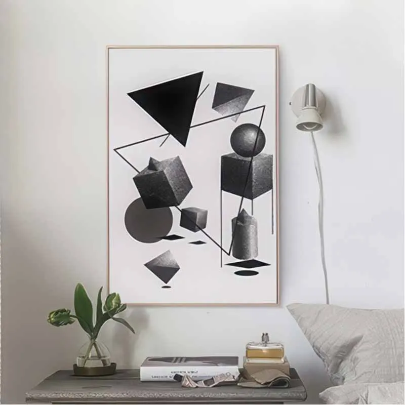 Tranh trừu tượng đen trắng với các hình khối đa dạng như tam giác, hình cầu và hình hộp